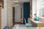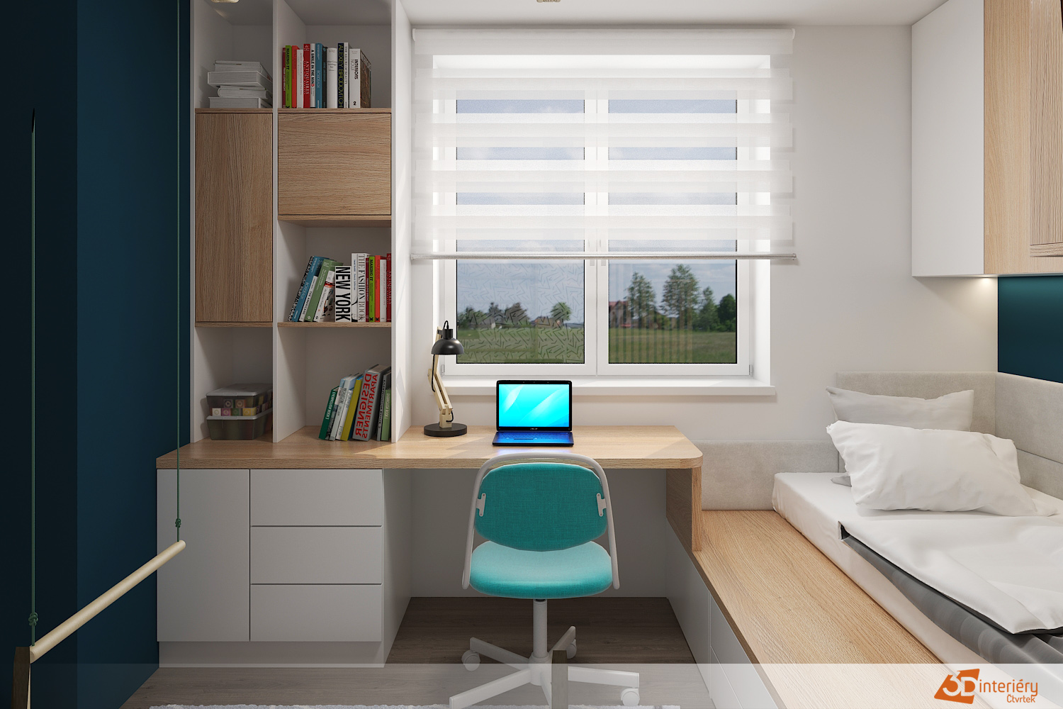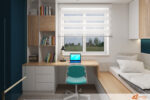 Napříč místností stojí psací stůl umístěný přímo pod oknem. Přímý sluneční svit zalévá pracovní plochu světlem, čímž podporuje soustředění při učení nebo tvoření. Na stole leží sešity, pastelky i lampa s nastavitelným ramenem. Vedle stolu se rozprostírá útulná postel s měkkým přehozem a několika polštáři v tlumených barvách. Kombinace pohodlí a jednoduchosti vytváří ideální prostor pro odpočinek.