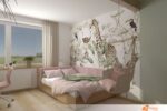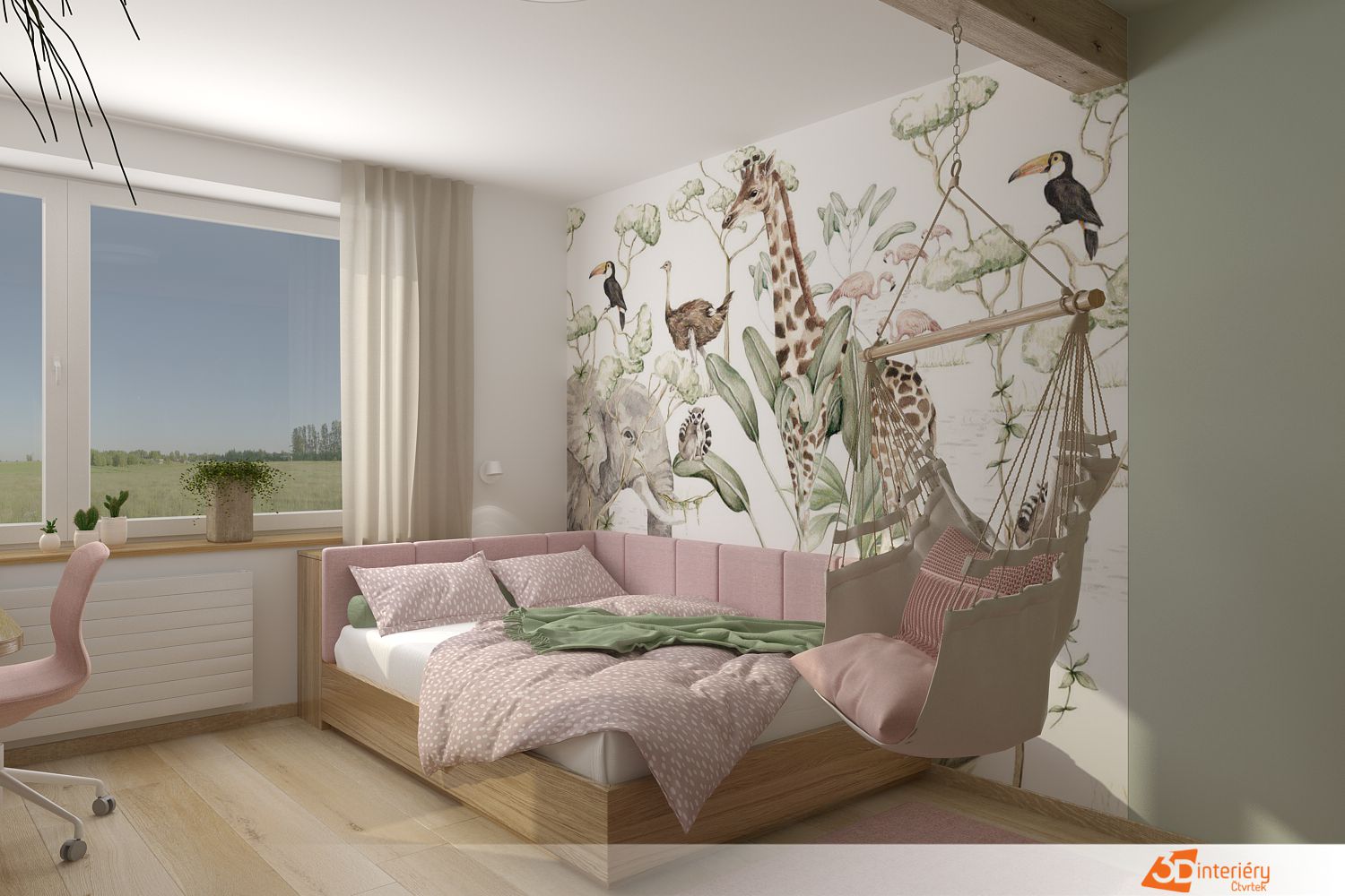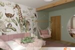 Pokoj působí vesele a útulně. Stěny hrají růžovými a zelenými odstíny, které navozují hravou atmosféru. Hned po vstupu zaujme barevná tapeta na stěně u postele. Rozprostírá se na celé ploše a zobrazuje vysokou žirafu s laskavým pohledem. Kolem ní pobíhají malí kamarádi – slon s dlouhým chobotem, usměvavý hroch i několik roztomilých ptáčků. Postel stojí přímo u této stěny, takže každý večer končí pohledem na zvířecí svět plný fantazie.