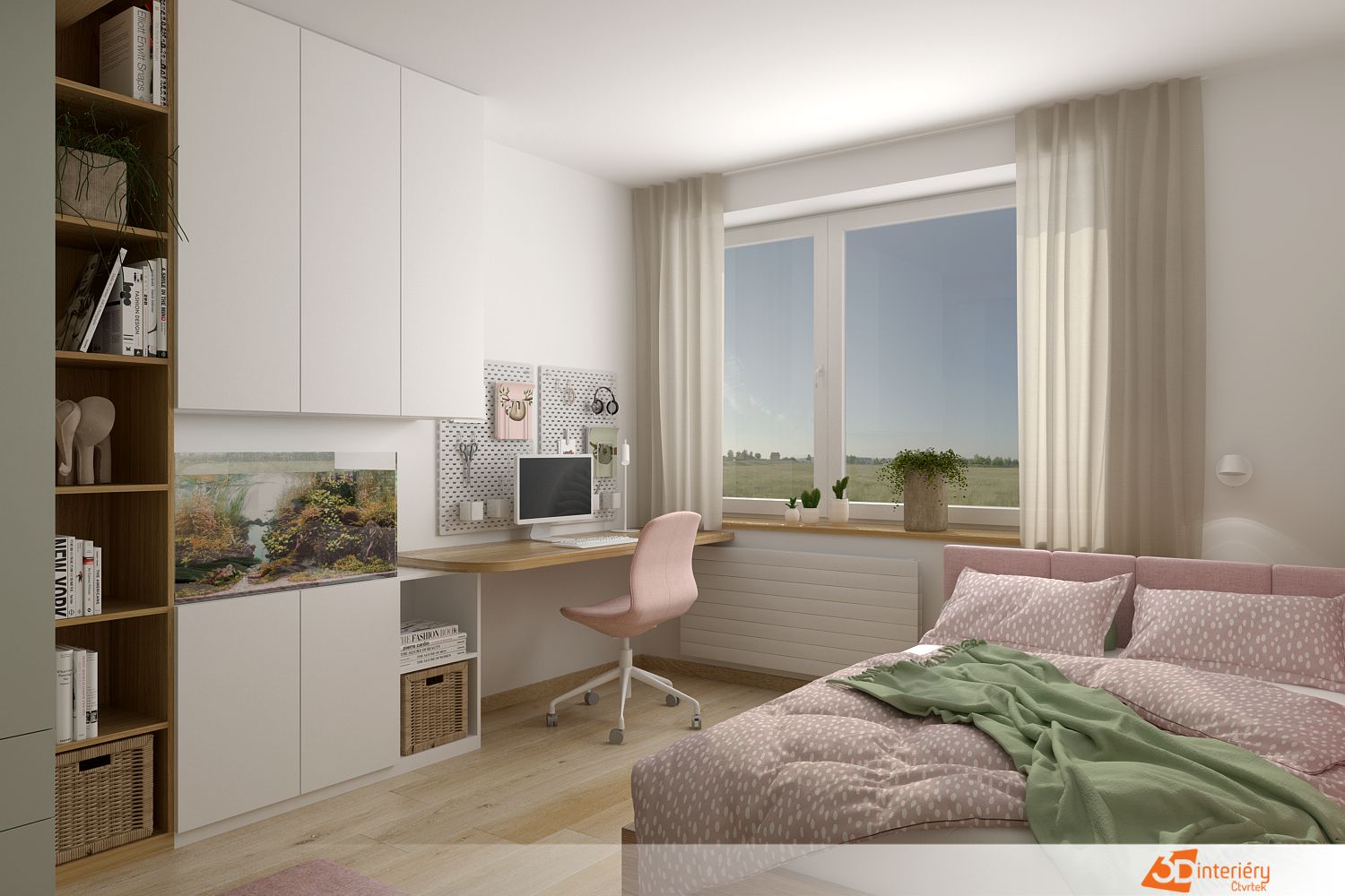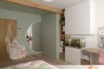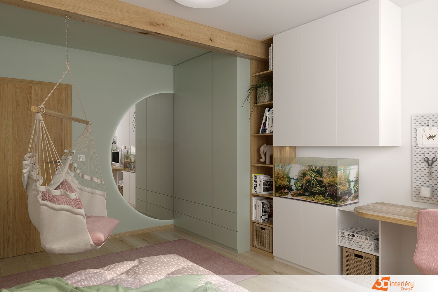 Druhá stěna, naproti posteli, drží dominantu v podobě velkého kulatého zrcadla. Zrcadlo odráží barevnost místnosti a přidává pocit prostornosti. Dětské hračky leží pečlivě seřazené v policích, zatímco malé křesílko v rohu vybízí k posezení s knížkou. Sluneční světlo proniká skrz lehké záclony, které jemně ladí s růžovým tónem stěn. Zelené detaily v podobě koberečku a polštářků dotvářejí svěží dojem. V tomto pokojíku se fantazie cítí jako doma.
