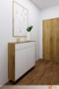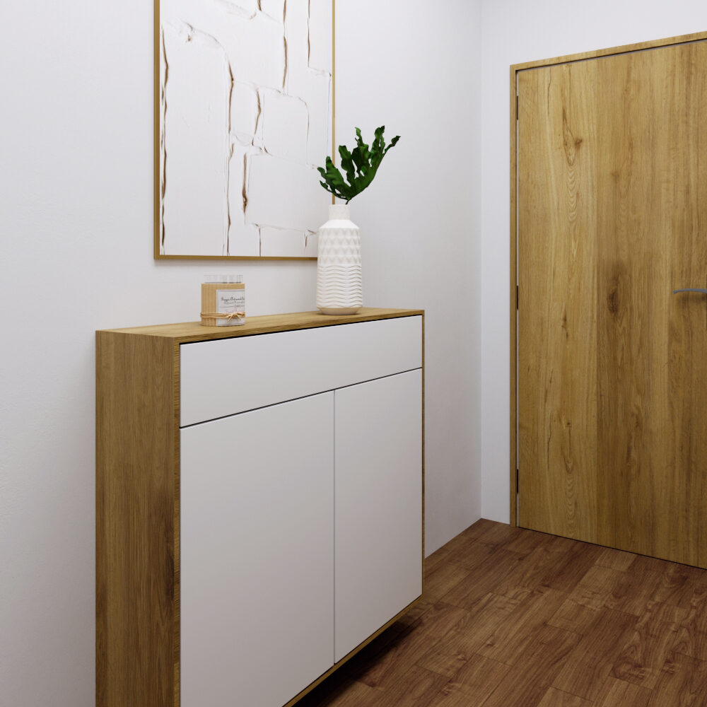 U zdi stojí botník v bílé barvě, jehož dřevěný rám ladí s dřevěnými dveřmi a doplňuje estetiku prostoru. Povrch botníku působí hladce a čistě, nabízí dostatek místa pro uspořádání obuvi, aniž by působil těžkopádně.