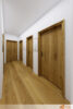 Předsíň působí svěže díky bílým zdím, které propouštějí světlo a zvětšují prostor. Dveře spolu s rámy z masivního dřeva dodávají místnosti přírodní teplo a kontrast k jasné bílé. Každý detail dřeva nese jemnou kresbu a podtrhuje celkovou atmosféru útulnosti.