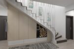 Pod schodištěm stojí praktický botník s jednoduchým designem, který nabízí dostatek úložného prostoru pro obuv. Nad botníkem se nacházejí otevřené poličky, ideální pro odkládání drobností, dekorací nebo klíčů. Kombinace krémové barvy na stěnách a některých doplňcích přináší do prostoru teplý tón, který měkčí kontrasty mezi černou a bílou.