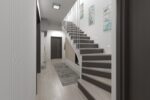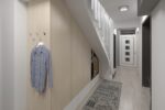Podlaha nese neutrální odstín, který ladí s celkovým konceptem a podporuje pocit čistoty a pořádku. Vstupní prostor působí vzdušně, i přes přítomnost velkého schodiště a úložných prvků. Všechny detaily spolu harmonizují, což vytváří příjemné prostředí při příchodu domů.