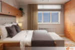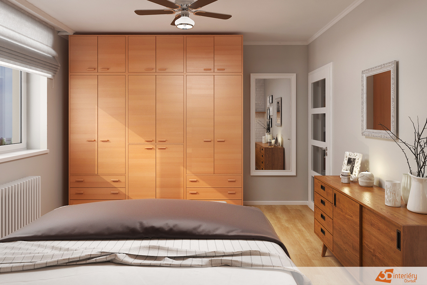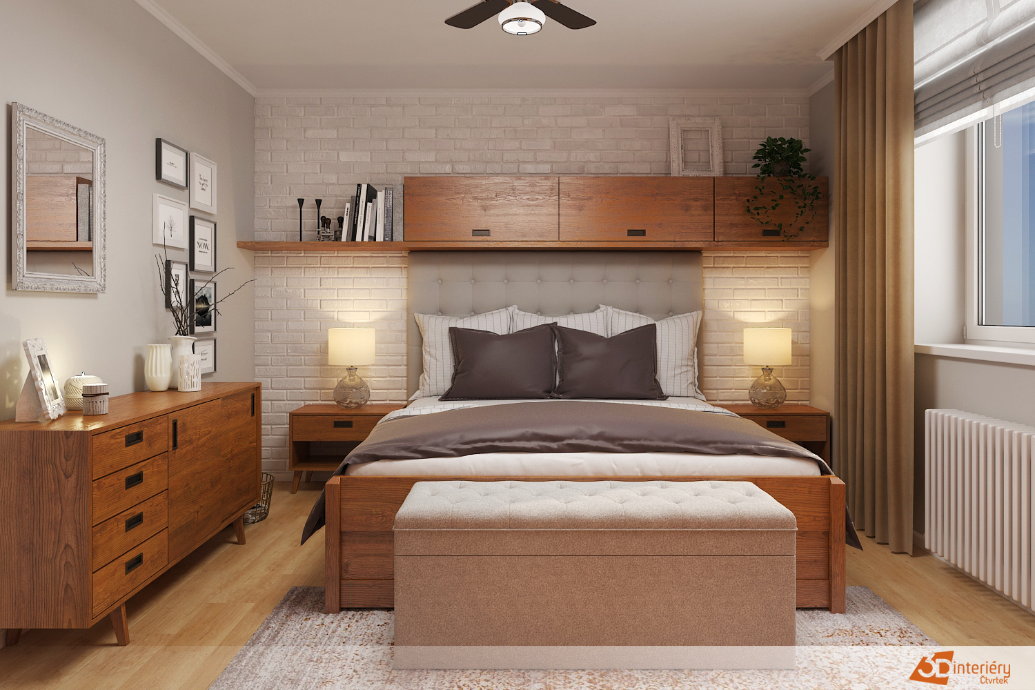 Vedle postele se nacházejí jednoduché noční stolky s lampičkami, jejichž světlo vytváří večer příjemně měkkou atmosféru. Okno vpouští dostatek denního světla, které během dne zvýrazňuje strukturu dřeva i jemnost krémových ploch.
