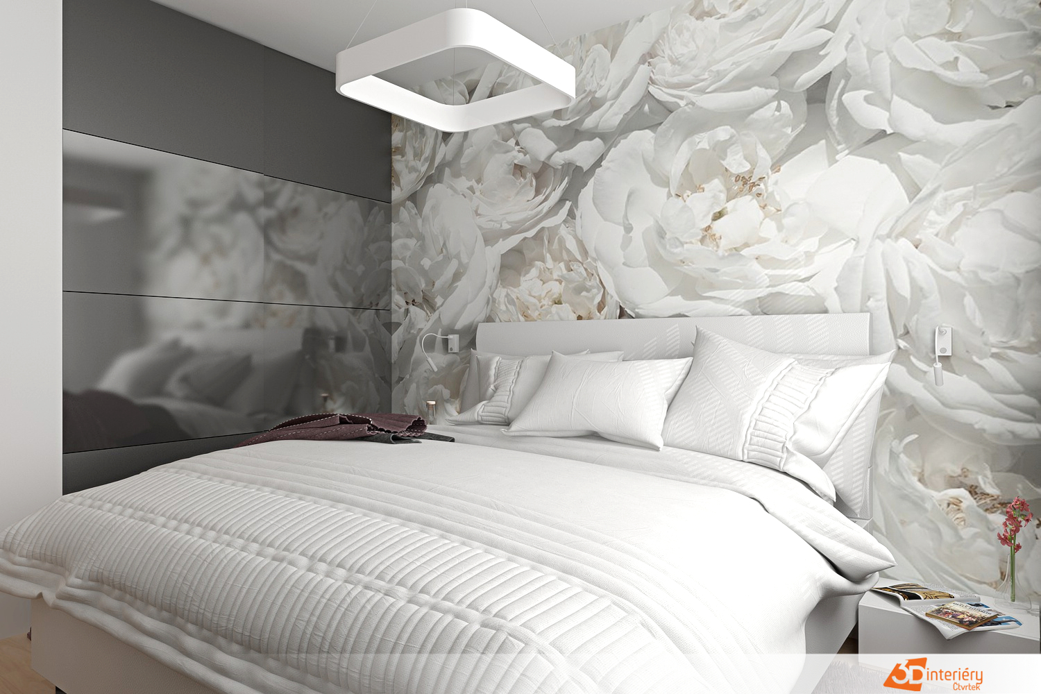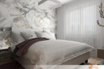 Na zdi u postele se rozprostírá tapeta plná listů bílé růže. Jemný květinový vzor přináší romantiku a hloubku, aniž by rušil celkový klid. Ložnice tak poskytuje prostor pro odpočinek, soustředění i estetické potěšení.