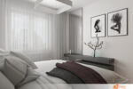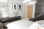 Vedle postele stojí černá lesklá skříň, která přináší kontrast a zároveň odráží okolní prvky, čímž opticky zvětšuje místnost. Dveře ze světlého dřeva působí jemně a příjemně propojují bílý prostor s teplejším tónem.