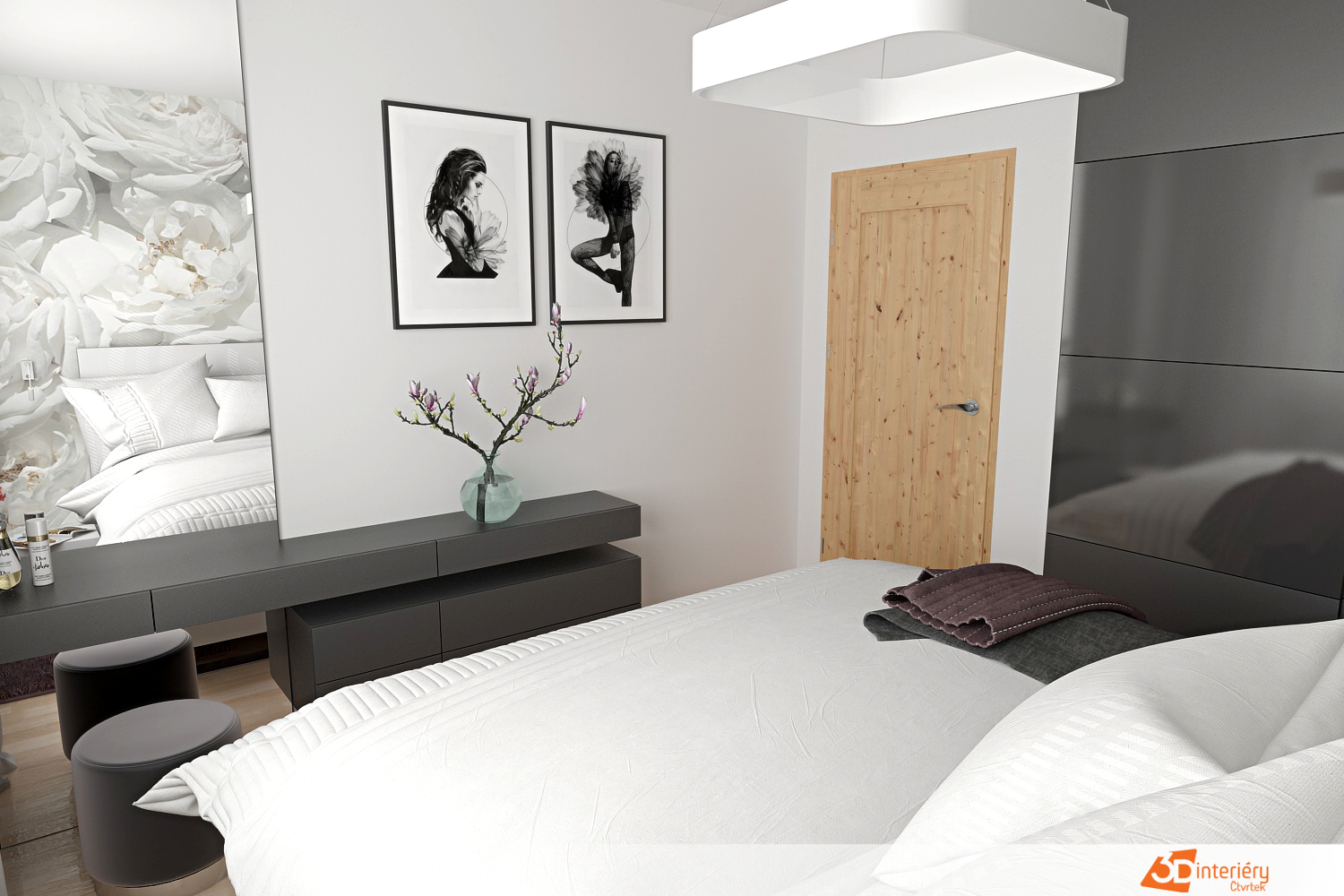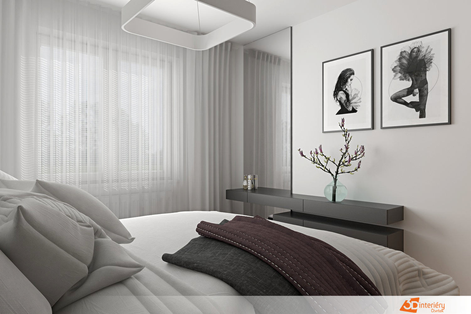 Ze stropu visí výrazný svítící prvek ve tvaru čtverce. Jeho hranatý design kontrastuje s jemnými motivy v místnosti, čímž vzniká zajímavá rovnováha mezi geometrií a romantikou. Naproti posteli, vedle zrcadla, visí dva černobílé obrazy. Jejich motivy se drží minimalistické linie, čímž zachovávají vizuální čistotu prostoru.