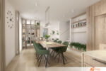 Obývací pokoj volně přechází do kuchyně a vytváří tak jednotný, otevřený prostor plný světla a vzdušnosti. Interiér sází na světlou paletu barev, která podporuje pocit klidu a prostornosti. Bílé stěny, nábytek i gauč tvoří čisté pozadí pro výraznější akcenty v podobě zelených doplňků. Zelené židle u jídelního stolu ladí s kobercem, který leží pod bílým gaučem a přináší do místnosti svěží, přirozený tón.
