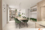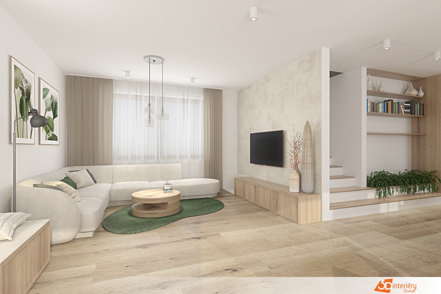 Zelené prvky, dřevo a bílá barva společně vytvářejí interiér, který působí svěže, klidně a přívětivě. Takový prostor podporuje uvolněnou atmosféru a současně zůstává stylový a praktický.