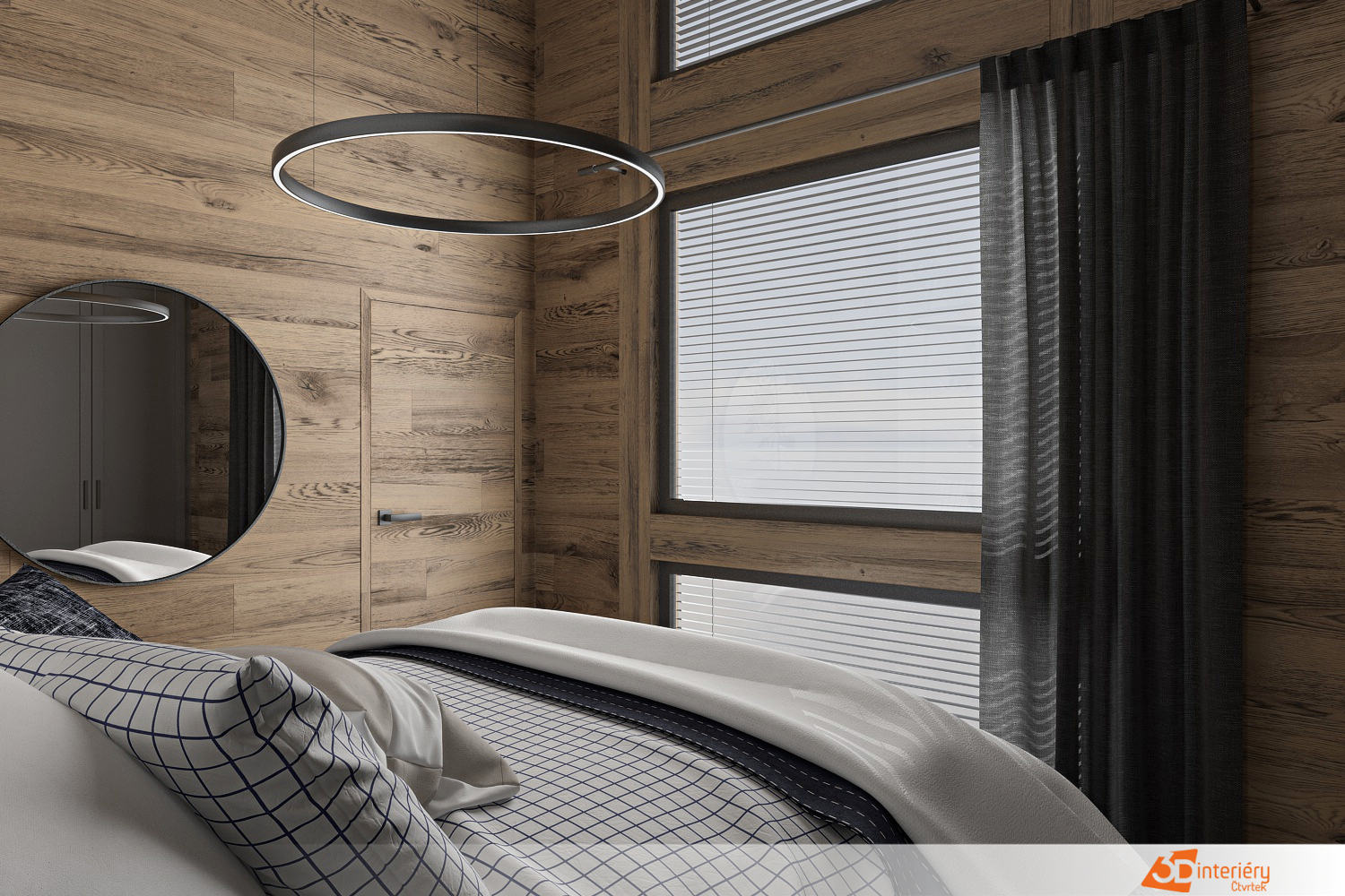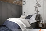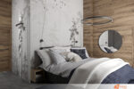 Celkový dojem místnosti kombinuje eleganci, praktičnost a inspiraci přírodou. Vznikl tak prostor vhodný k odpočinku i nerušenému soukromí v duchu současného designu. V rámci návrhu ložnice vznikl moderní prostor spojující kontrastní prvky a přírodní motivy. Středem místnosti se stává postel umístěná před stěnou s výraznou tapetou s rostlinným motivem. Listy v neutrálních tónech působí živě, přesto neruší klidnou atmosféru. Tapeta dodává hloubku a vizuální zajímavost, zároveň definuje prostor pro odpočinek.