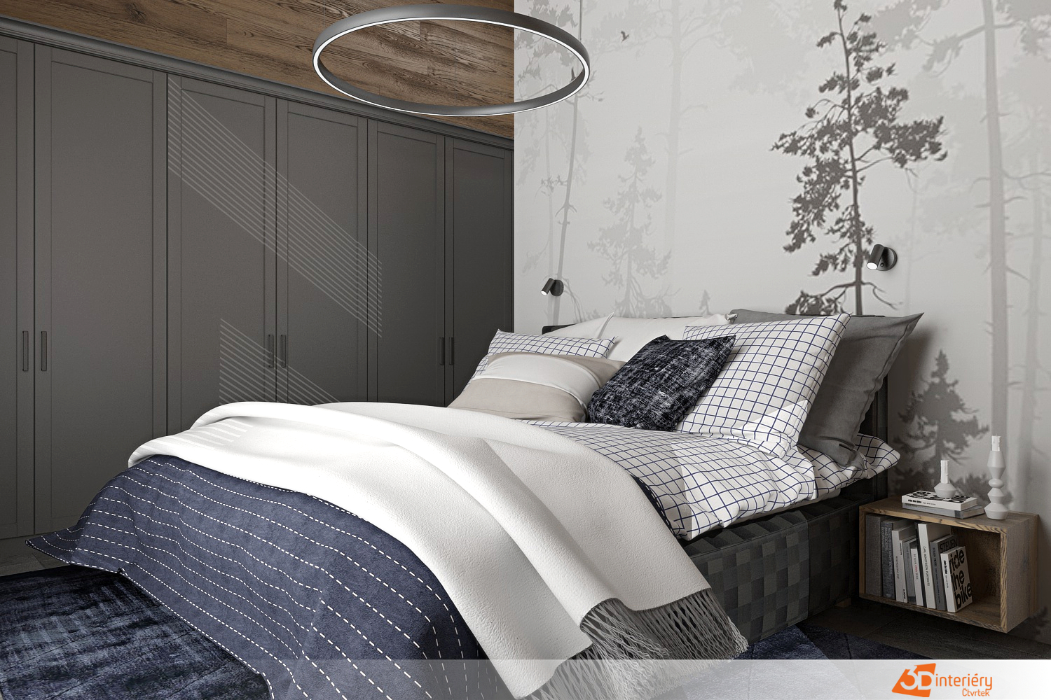 Podle návrhu ložnice vznikl moderní prostor spojující kontrastní prvky a přírodní motivy. Středem místnosti se stává postel umístěná před stěnou s výraznou tapetou s rostlinným motivem. Listy v neutrálních tónech působí živě, přesto neruší klidnou atmosféru. Tapeta dodává hloubku a vizuální zajímavost, zároveň definuje prostor pro odpočinek.