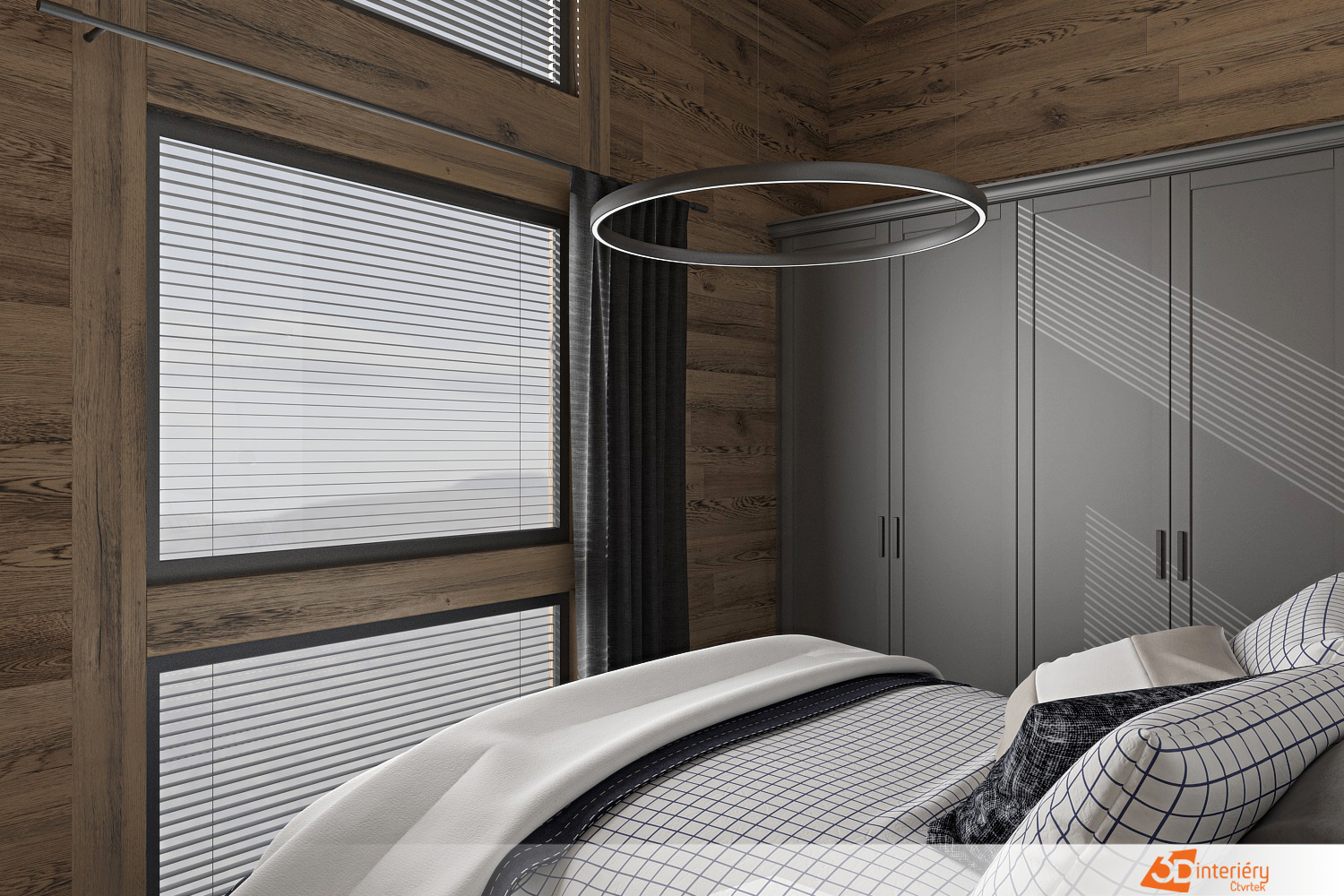 Osvětlení v místnosti vzniklo s ohledem na večerní i ranní využití. Závěsná světla nad nočními stolky, doplněná nepřímým světlem za čelem postele, zajišťují příjemné náladové osvětlení.