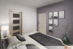 Zeď naproti posteli získala pastelově fialový odstín, který zjemňuje celkovou kompozici. Tato barva dodává interiéru jemný nádech romantiky, aniž by působila výrazně či rušivě. Na této ploše visí obrazy v decentních rámech, které vnášejí do místnosti rytmus a osobní výraz.