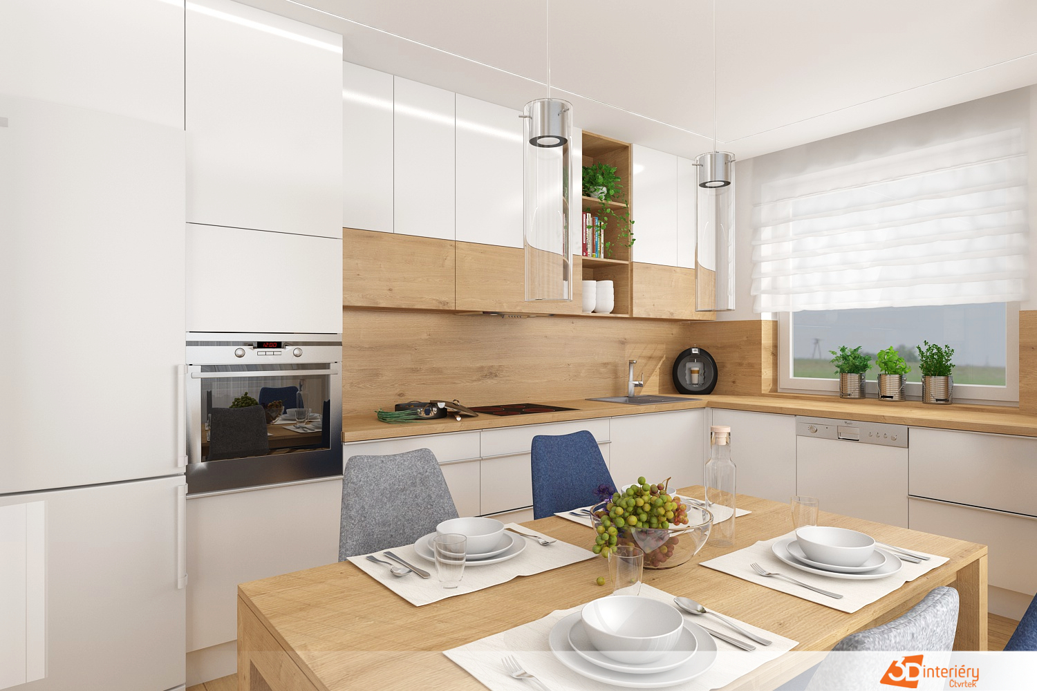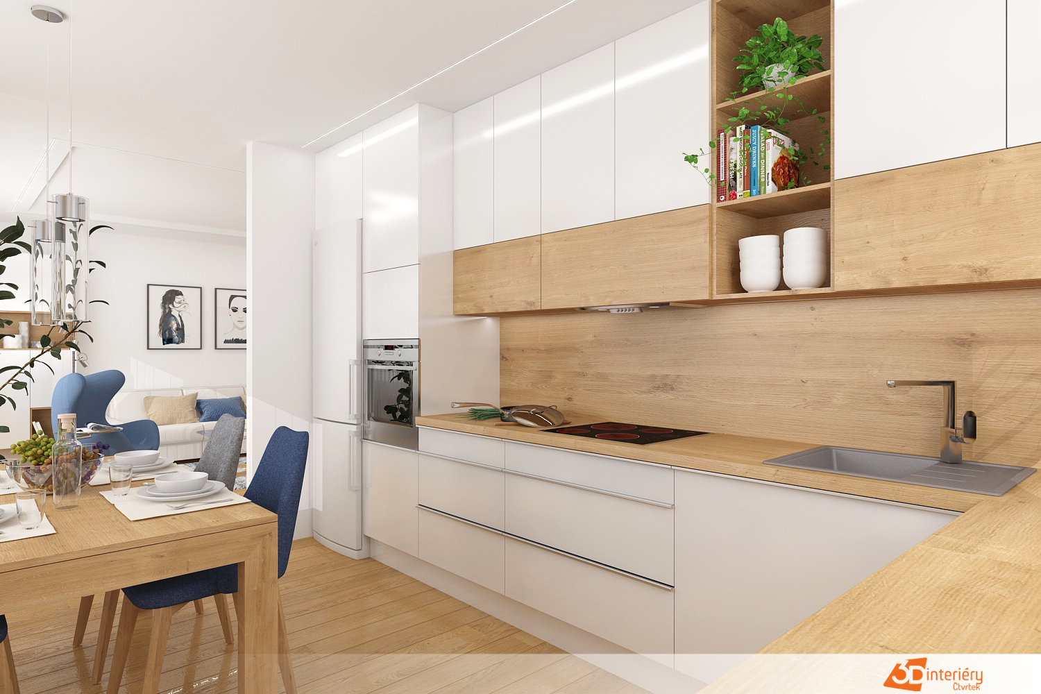 Návrh rekonstrukce v domě – při rekonstrukci kuchyně a obývacího pokoje byli majitelé nakloněni myšlence propojit místnosti ubouráním dělící příčky. Zazděním dveří do kuchyně se nabídla ideální dispozice pro sestavení funkční a praktické kuchyňské linky. Propojení a sjednocení prostoru jsme dosáhli také díky nové vinylové podlaze. Pro rozmístění interiérového osvětlení jsme využili snížení stropu sádrokartonem, do kterého jsou zapuštěny led diodové pásky v hliníkových lištách.