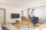 Dominantou obývacího pokoje je velká sedací souprava od Aksamite. Výrazným soliterem je pohodlné modré křeslo ve tvaru vajíčka. Při výběru materiálů jsme vsadili na eleganci, nadčasovost a praktičnost. Nábytek je vyroben na míru v kombinaci dubové dýhy a bílého matného nástřiku. Výrazné zastoupení zde sehrává i sklo (osvětlení, police, deska stolku, obklad za kuchyňskou linkou), které působí čistě a odlehčeně. V klidové zóně nechybí kvalitní vlněný koberec. Také na okna jsme použili textilní zastínění v podobě moderních voálových záclon a závěsů.