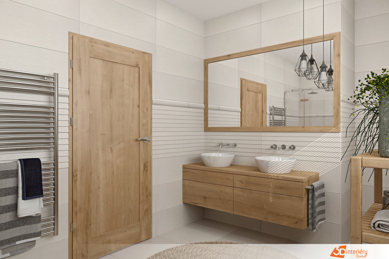 Koupelna po rekonstrukci získala výrazný přírodní charakter díky použití dřeva v několika prvcích. Dvě umyvadla zasazená do dřevěné skříňky poskytují dostatek prostoru pro každodenní hygienu a zároveň působí elegantně a prakticky. Nad umyvadly visí velké zrcadlo, orámované dřevem, které dokonale ladí s ostatními dřevěnými prvky a opticky zvětšuje prostor.