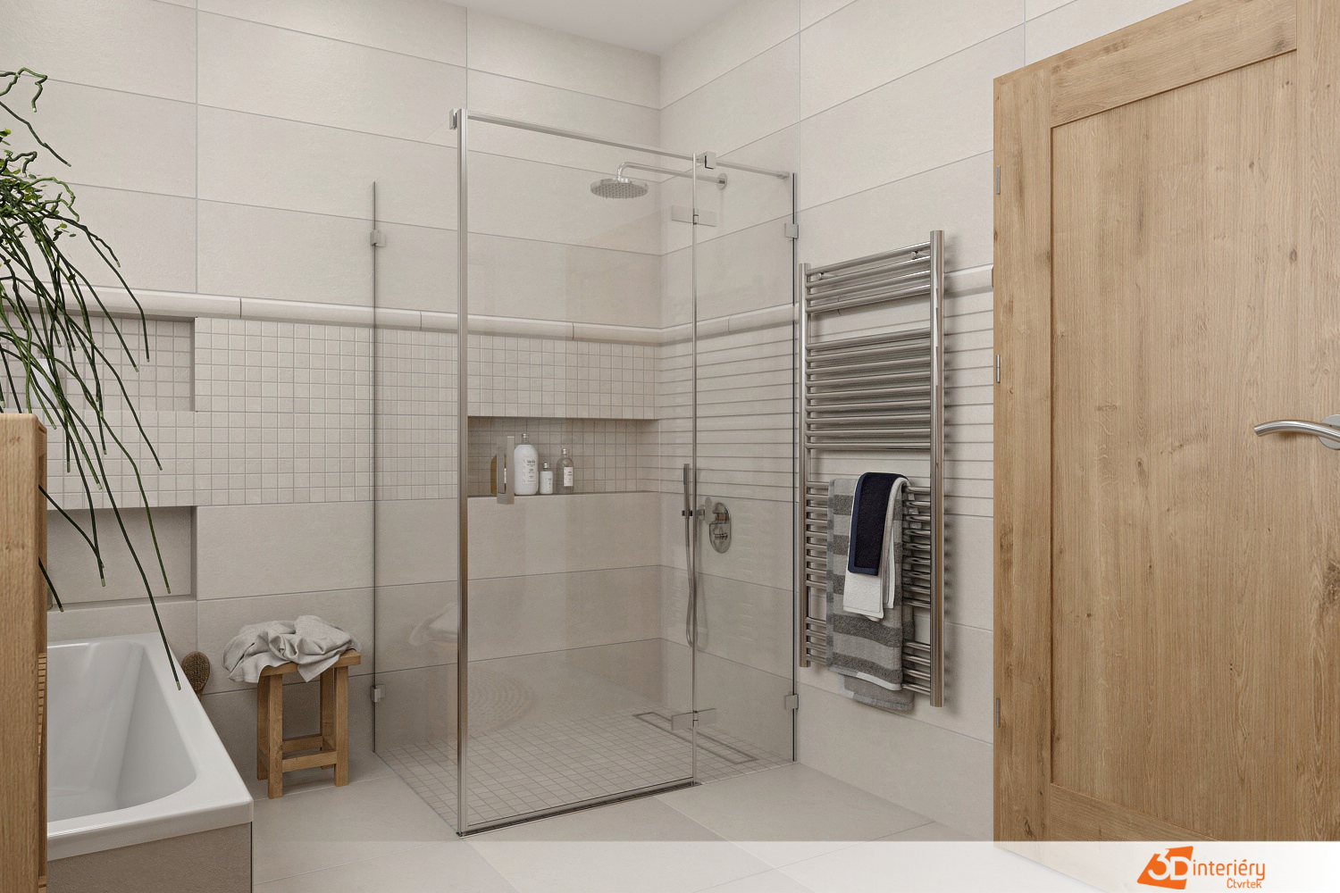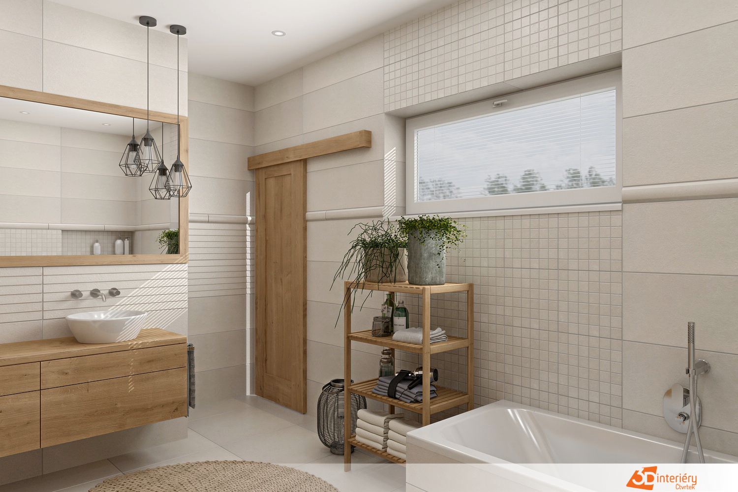 Dřevěné dveře doplňují celkový vzhled a navozují příjemnou a teplou atmosféru. V koupelně nechybí ani dřevěné poličky, na nichž se nachází dekorace v podobě zelených rostlin v květináčích. Tato zeleň přináší do prostoru živost a svěžest, která kontrastuje s teplým tónem dřeva a dodává koupelně harmonii.