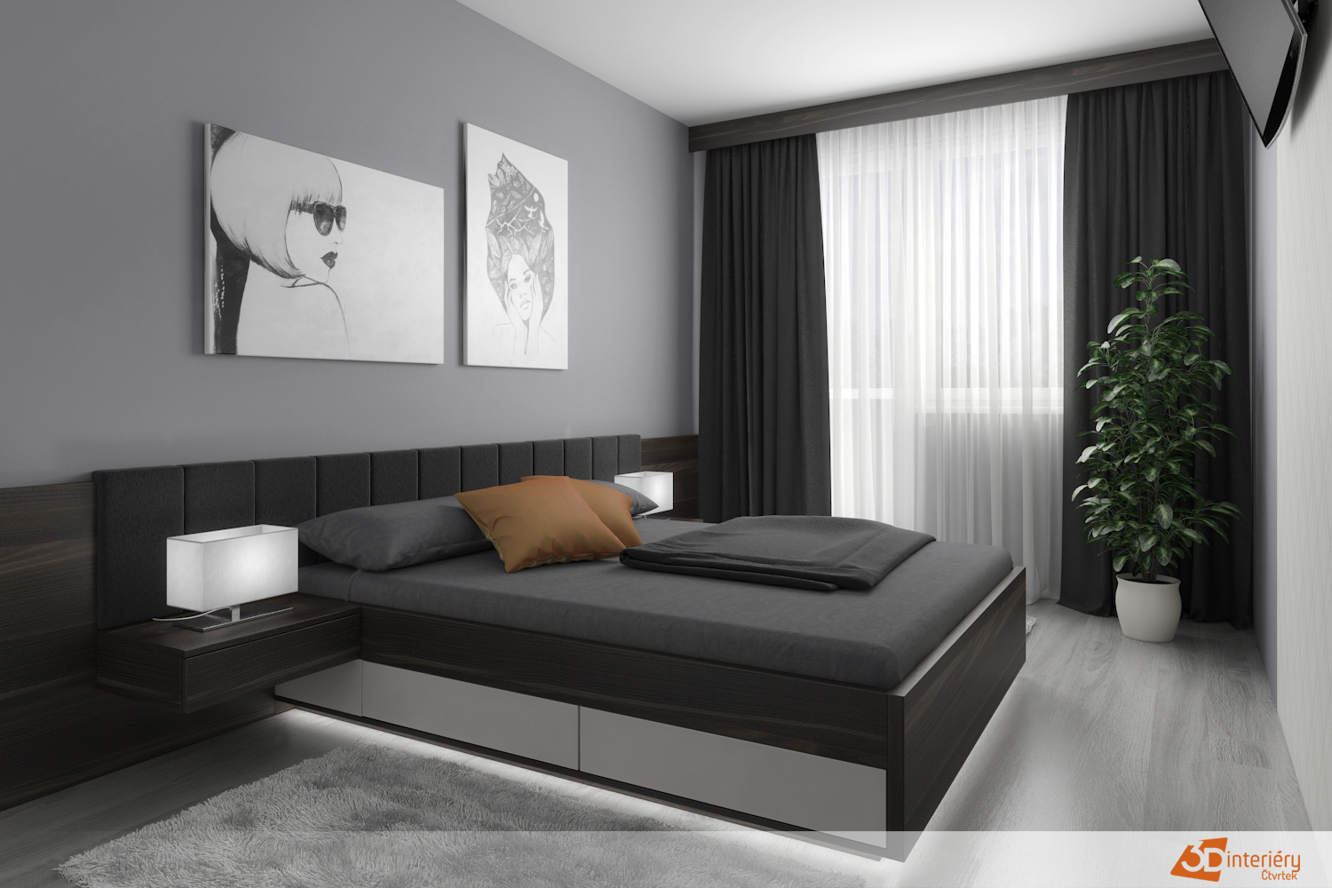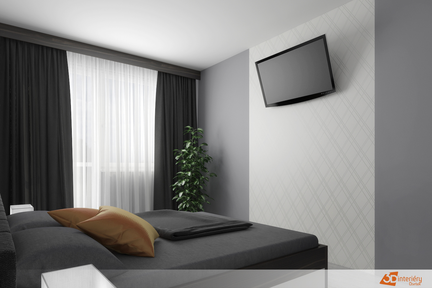 Nově upravený prostor ložnice působí klidně, vyváženě a zároveň velmi stylově. Dlouhé černé závěsy padají až k zemi a elegantně rámují okno. Tmavá textilie pohlcuje přebytečné světlo a zajišťuje ničím nerušený spánek i vizuální rovnováhu s ostatními prvky interiéru.