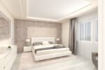 Luxusní ložnice spojuje eleganci s klidem díky pečlivě vybrané kombinaci bílé a šedivé. Každý detail nese jasný záměr – vytvořit prostor, kde forma podporuje funkci a estetika neustupuje pohodlí. Dominantní postel stojí uprostřed místnosti, pokrytá vrstvami jemného povlečení v odstínech šedé. Nad ní se vznáší designové svítidlo, které vrhá měkké světlo a zdůrazňuje textury lůžkovin.