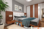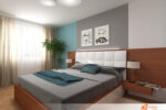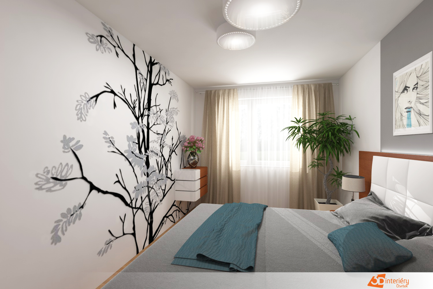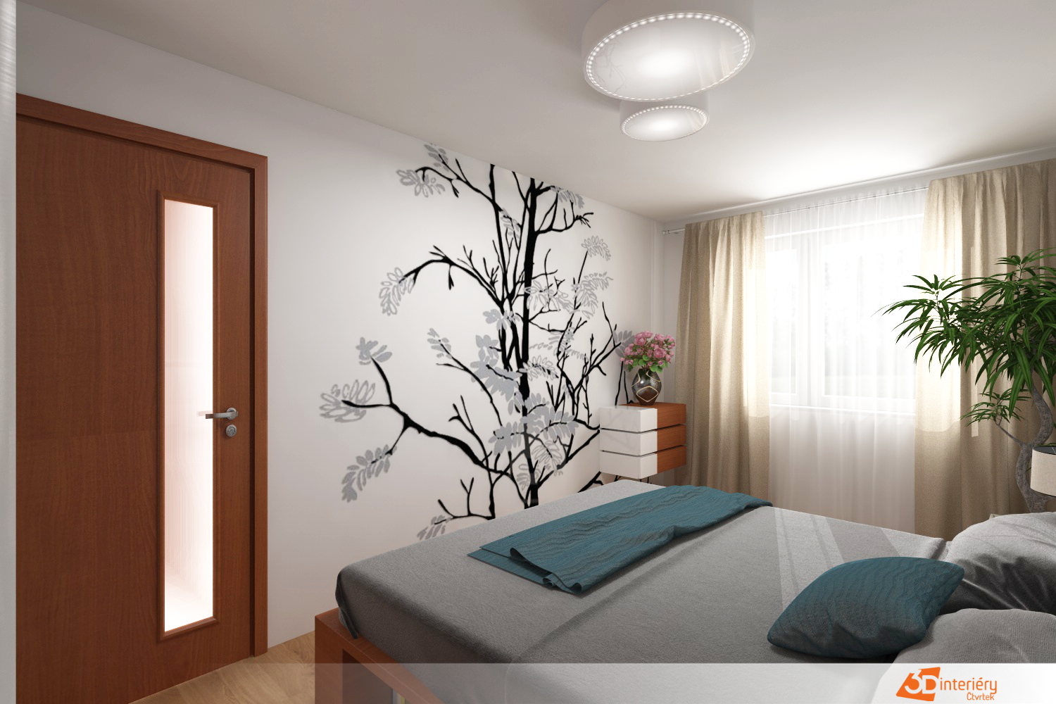 Ložnice působí svěže a vzdušně. Bílé stěny odrážejí světlo a nechávají vyniknout jednomu výraznému prvku – tapetě s motivem velkého stromu. Tapeta pokrývá celou jednu stěnu a přináší do prostoru klid i symboliku zakořenění a růstu. Rozvětvená koruna sahá až ke stropu, zatímco kmen tvoří stabilní osu místnosti.