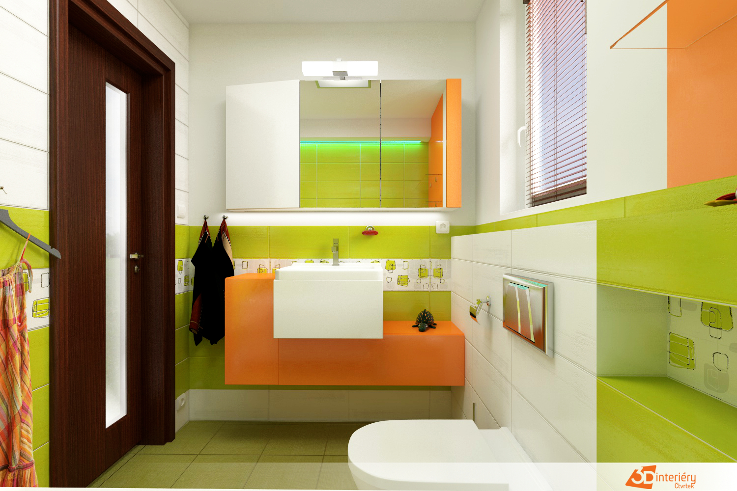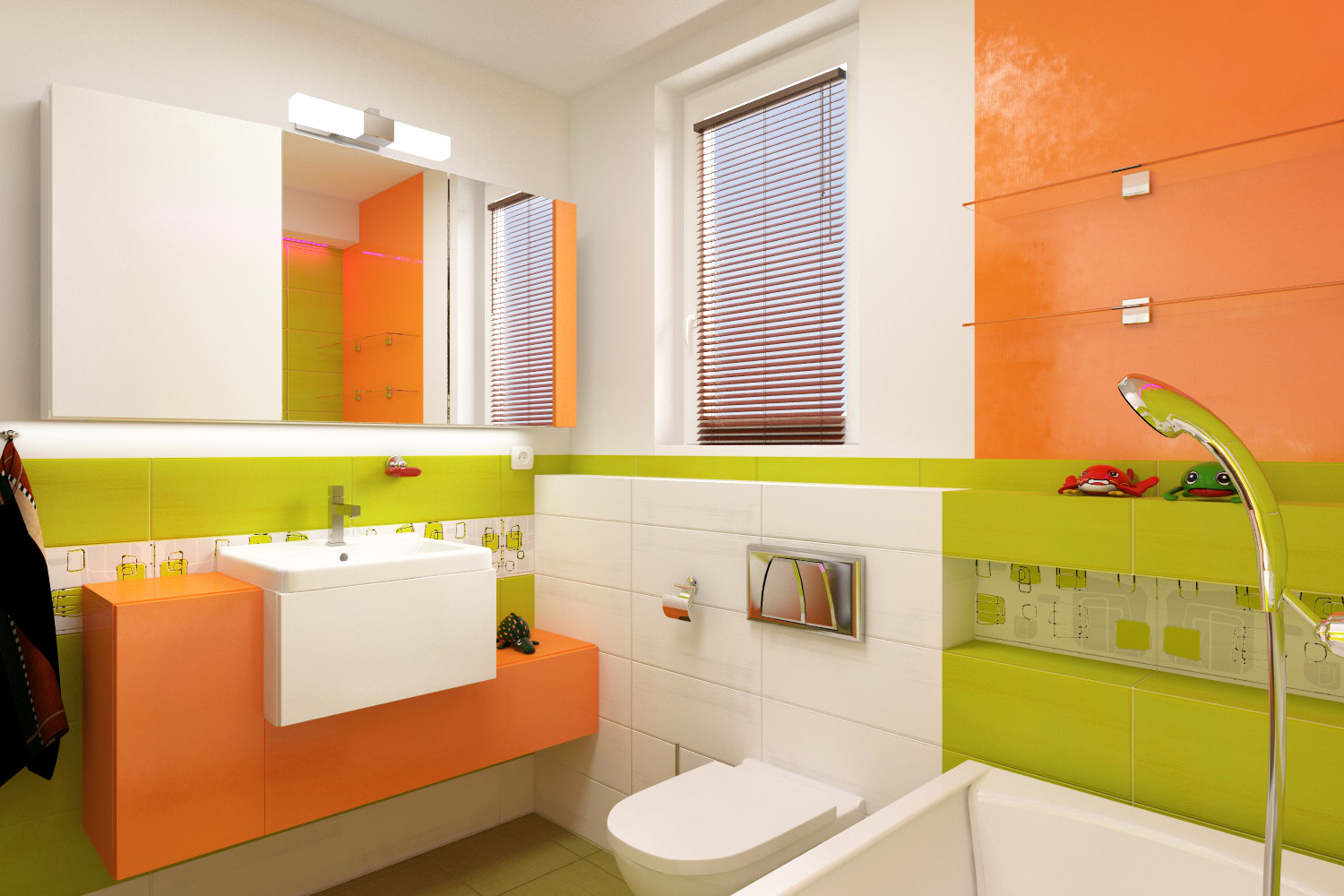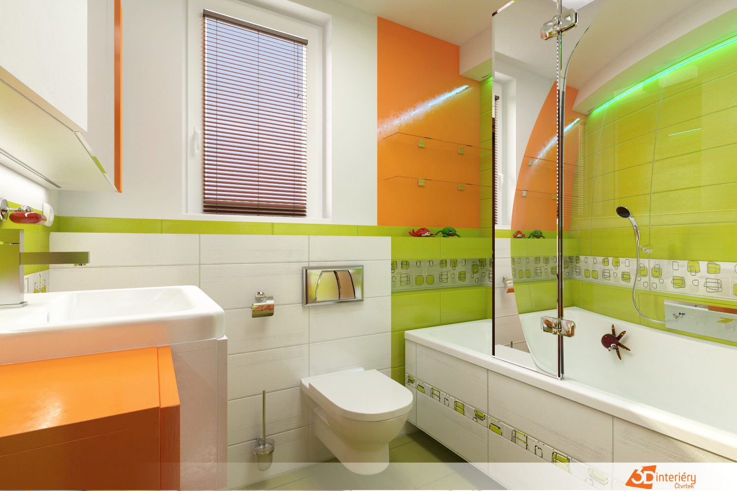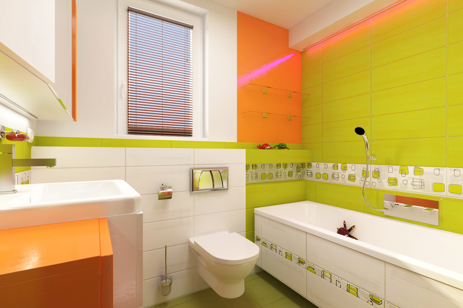 Barevná koupelna nabízí živý a hravý prostor, kde oranžová, zelená a žlutá spolu vytvářejí radostnou atmosféru. Každý odstín přináší energii a svěžest, která naplňuje celou místnost. Stěny nesou barevné vzory, které připomínají letní zahradu plnou květin a listů.