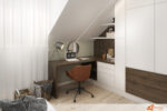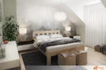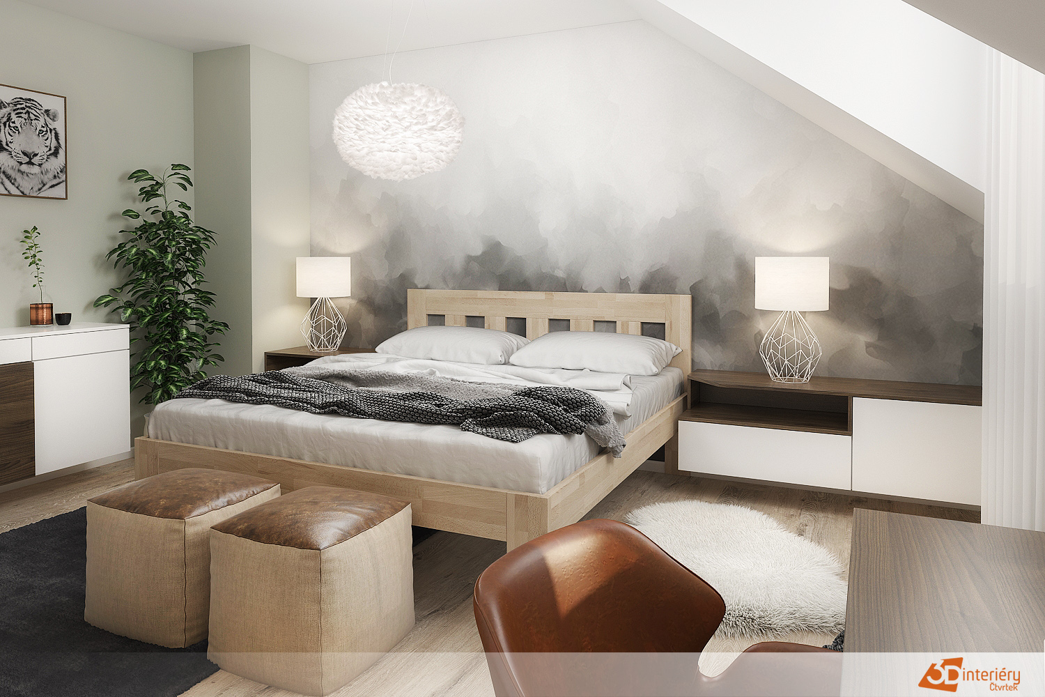 vLožnice působí klidným a harmonickým dojmem, ideálním pro odpočinek a načerpání nové energie. Ústředním bodem místnosti je postel z světlého dřeva, která vnáší do prostoru přírodní teplo a jemnost. Její jednoduchý, čistý design se skvěle hodí do moderně laděného interiéru, aniž by působil chladně nebo neosobně.