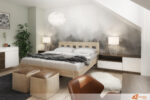 Za postelí se nachází výrazný, ale zároveň jemný dekorativní prvek – tapeta, která začíná od podlahy šedivým tónem a postupně přechází do bílé směrem ke stropu. Tento barevný přechod působí velmi esteticky a opticky zvětšuje prostor, zároveň přináší pocit hloubky a lehkosti. Stěna za postelí tak není jen pozadím, ale stává se součástí celkové atmosféry místnosti.