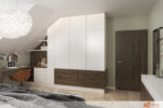 Na obou stranách postele jsou umístěny lampičky, které dodávají prostoru měkké, teplé světlo a zároveň podtrhují symetrii a vyváženost celé kompozice. Díky kombinaci světlého dřeva, decentní barevnosti a chytrého osvětlení působí ložnice svěže, uklidňujícím dojmem a zve k ničím nerušenému odpočinku.