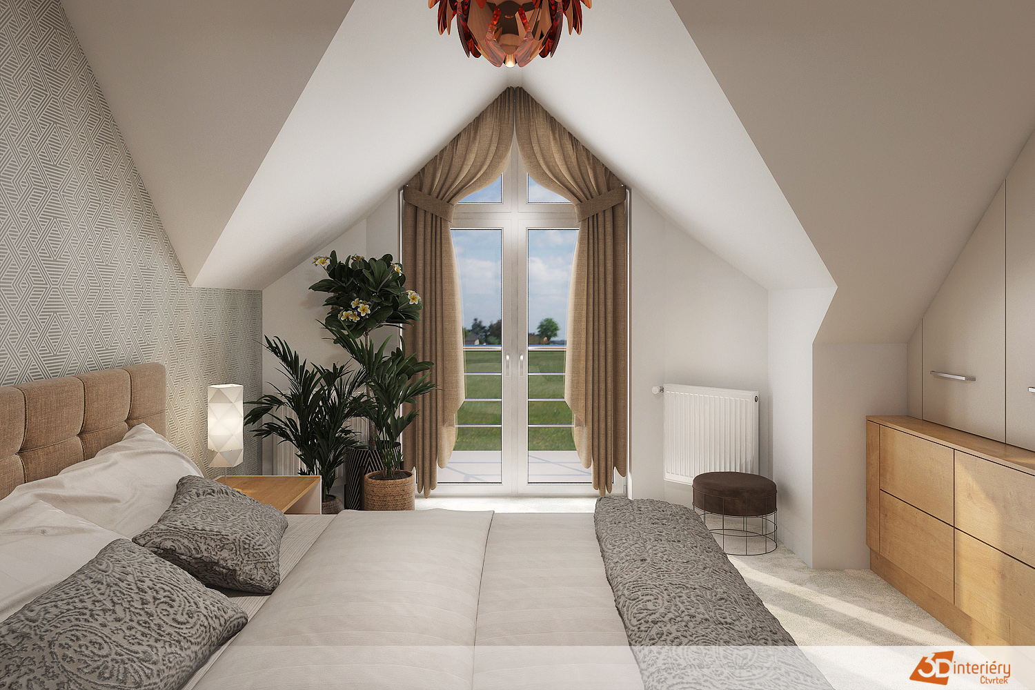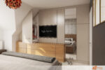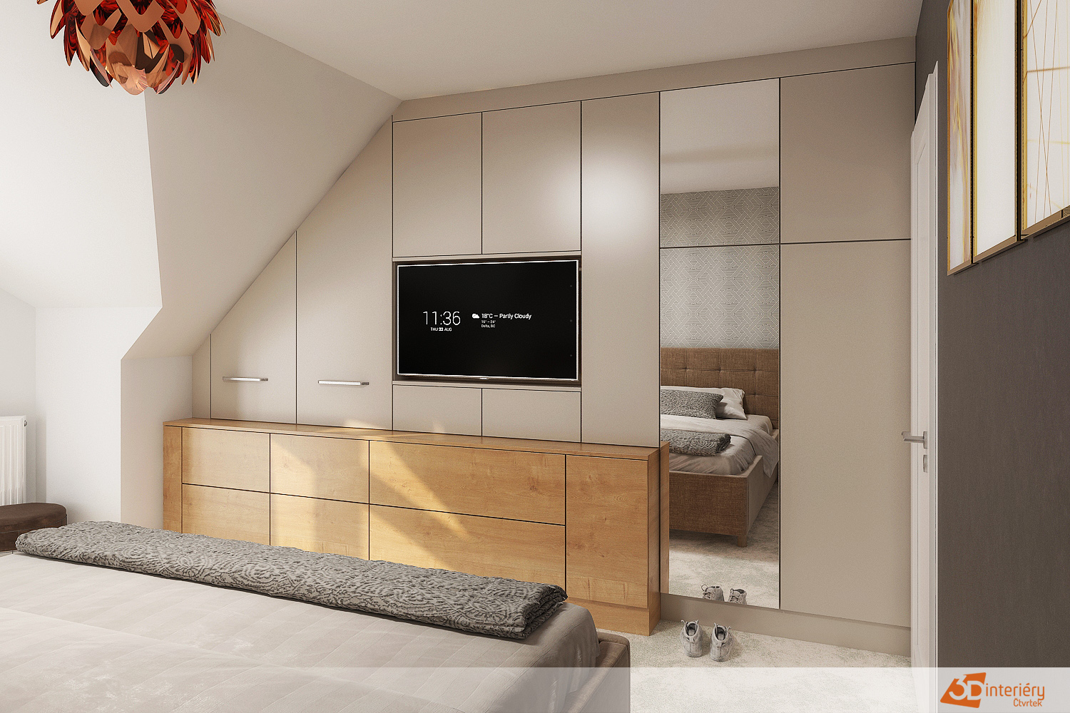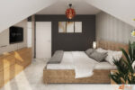 Ložnice působí prostorně a moderně díky promyšlenému uspořádání nábytku i architektury. Televize vestavěná do zdi zaujímá hlavní pozici a zároveň nenarušuje čistotu linie místnosti. Pod televizí se rozkládá skříň s velkým úložným prostorem, která pomáhá udržet pořádek a zajišťuje, že vše potřebné zůstává snadno po ruce, ale skryté před očima.