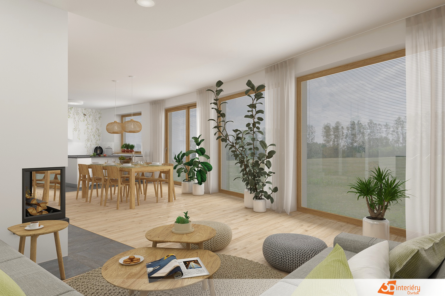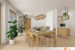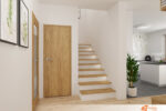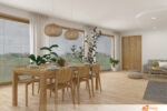 Obývací pokoj spojuje přírodní materiály s jednoduchým a elegantním designem. Jídelní stůl a židle z masivního dřeva přinášejí do prostoru teplo a přirozenou texturu, která kontrastuje s čistě bílými zdmi. Bílé pozadí rozšiřuje prostor a nechává vyniknout dřevěným prvkům, které dodávají místnosti charakter a útulnost.