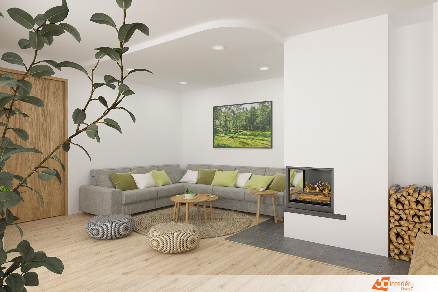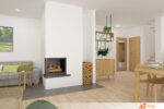 Vedle gauče stojí krb, který do místnosti vnáší další prvek tepla a komfortu. Oheň v krbu dodává prostoru příjemnou energii a přispívá k domácí pohodě. Tento obývací pokoj představuje harmonii přírody, pohodlí a jednoduchosti.