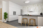 V obývací části dominuje šedý rohový gauč, na kterém leží zelené polštářky. Zelená barva přidává prostoru svěžest a oživuje neutrální šedou, čímž vzniká vyvážená kombinace barev. Gauč nabízí pohodlné místo k relaxaci po náročném dni.