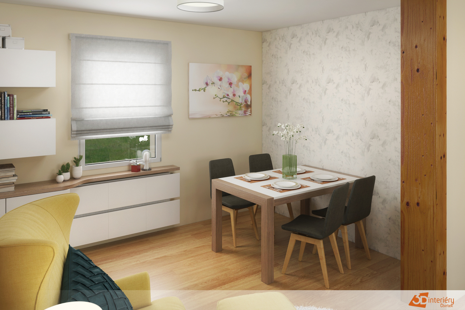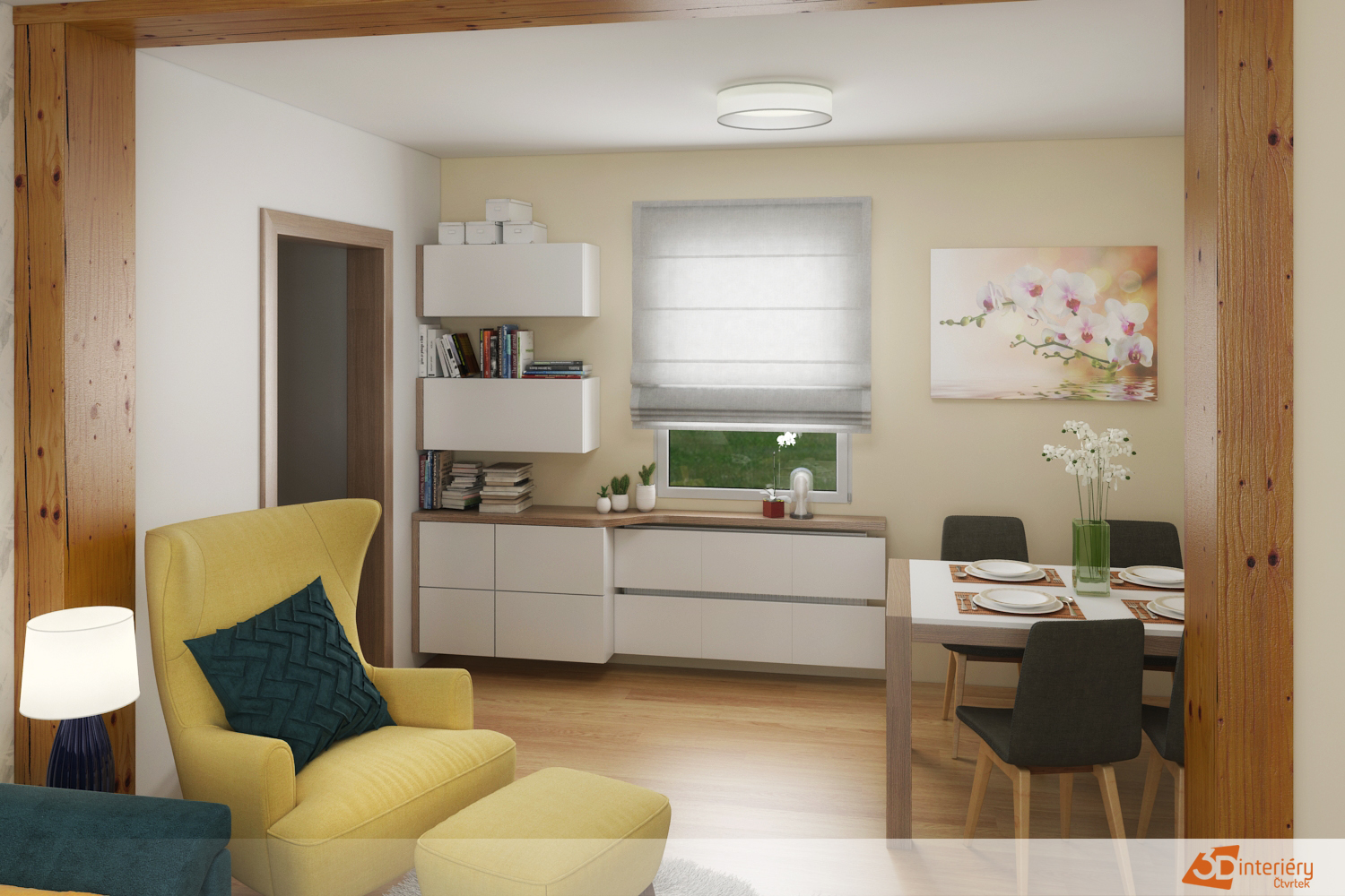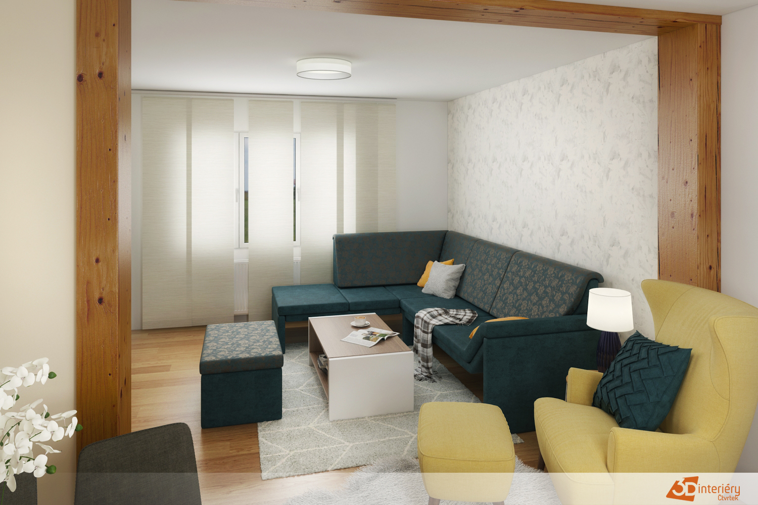 Celý interiér působí harmonicky a vyváženě. Zvolené barvy se doplňují – neutrální základ gauče zajišťuje klid a žluté křeslo přidává charakter. Doplňky jako měkký koberec, teplé osvětlení a několik zelených rostlin podtrhují útulnou atmosféru.