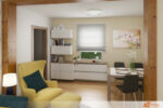 Obývací pokoj s velkým rohovým gaučem a světle žlutým křeslem působí pohodlně, svěže a přívětivě. Rohová sedačka nabízí spoustu prostoru pro rodinné sešlosti, lenošení i práci z domova. Její neutrální odstín – například šedá, béžová nebo krémová – vytváří klidné pozadí, které nechává vyniknout ostatním prvkům v místnosti.