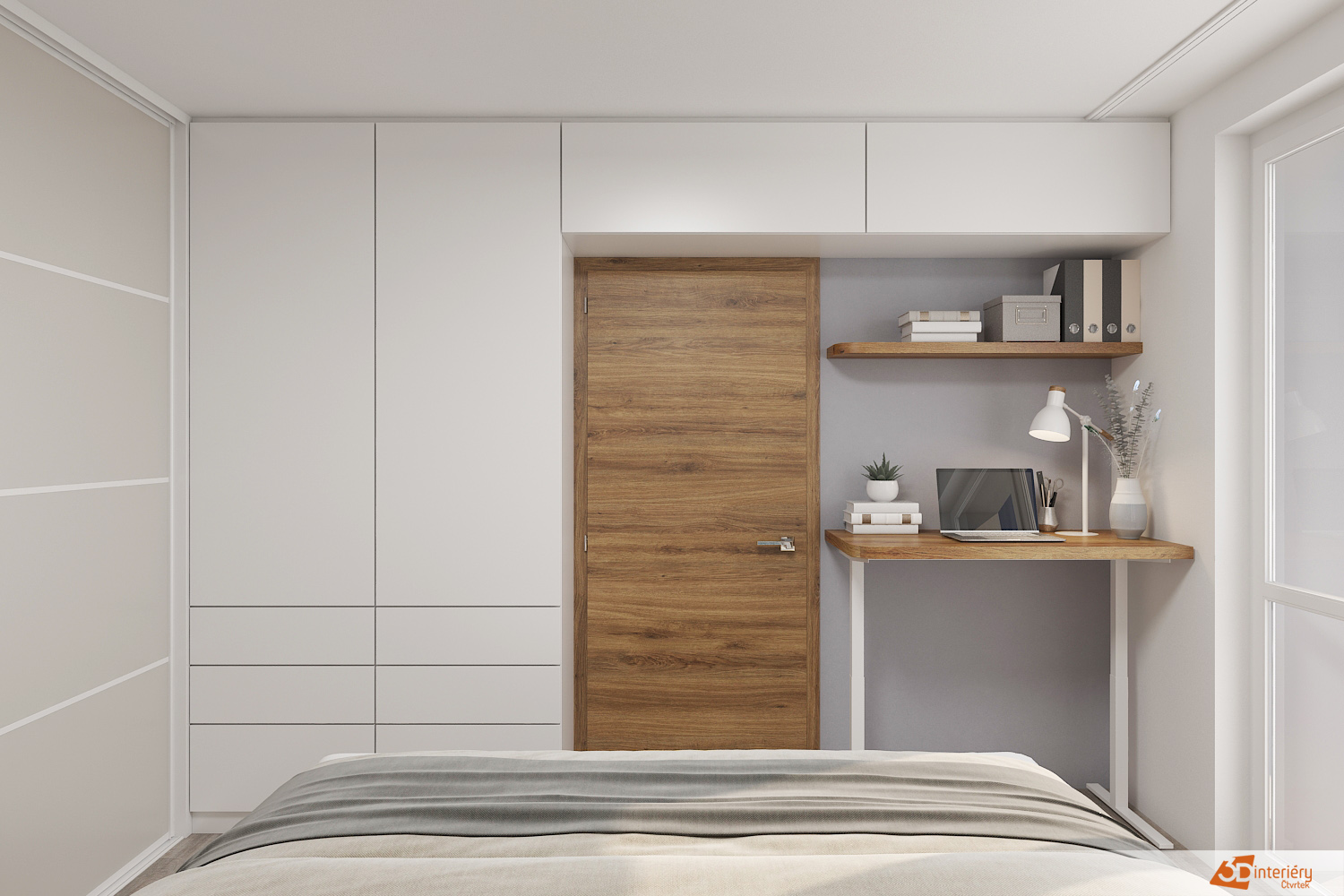 Místo tradiční zdi slouží vestavěná skříň v bílé barvě, která vizuálně rozšiřuje prostor a přispívá k celkové světlosti místnosti. Posuvné dveře skříně šetří místo a umožňují snadný přístup k oblečení či dalším věcem.