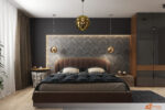 Celková kompozice vyvolává pocit luxusu, útulnosti a soukromí. Tmavá ložnice s propracovanými detaily slouží jako ideální útočiště pro odpočinek po náročném dni a zároveň jako designový zážitek.