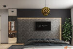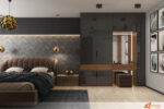 Vedle postele stojí černá skříň s lesklým povrchem. Odrazy světla na jejím povrchu oživují prostor a vytvářejí zajímavou hru světla a stínu. Všechny prvky v místnosti spolu ladí – tmavé tóny působí klidně, zatímco zlatý akcent přináší dotek elegance.