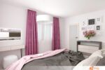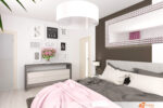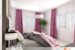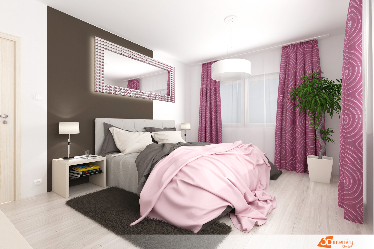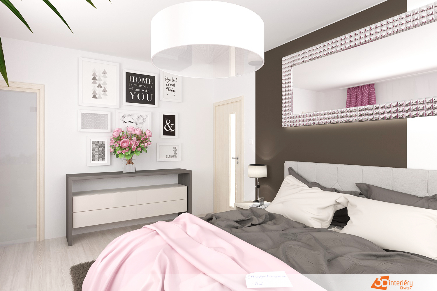 Ložnice působí stylově a odvážně. Růžová, bílá a černá spolu tvoří výrazný, přitom vyvážený celek. Bílé stěny odlehčují prostor, zatímco černý pruh za postelí dodává hloubku i vizuální ukotvení. Kombinace působí moderně, s jemným nádechem ženskosti i dramatu.