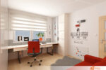 Útulná kancelářská místnost vítá návštěvníky příjemnou atmosférou a promyšleným uspořádáním. Dominantou prostoru se stává prostorná červená sedačka, která okamžitě upoutá pozornost. Její sytý odstín kontrastuje s okolním vybavením a dodává interiéru energii i špetku neformálnosti.