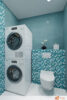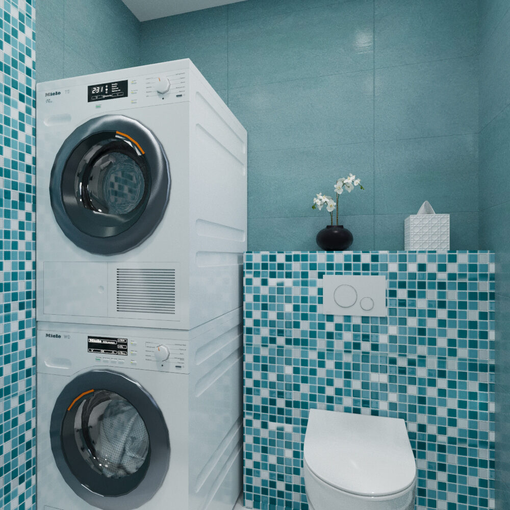 Útulná koupelna s odstíny modré navozuje pocit klidu, čistoty a svěžesti. Stěny pokrývají obklady v různých tónech – od světle modré po sytě námořnickou. Barevná kombinace vytváří jemný kontrast a zároveň podporuje relaxační atmosféru. Umyvadlová skříň s modrými dvířky ladí s ostatními prvky, zatímco bílá keramika působí svěže a lehce.