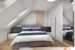 Podél vyšší zdi se nachází komoda s dekoračními předměty, zrcadlem a květinami. Okenní výklenek poskytuje prostor pro čtecí koutek – měkký polštář, hřejivá deka a malý stolek zvou ke chvílím s knihou. Dřevěná podlaha v přírodním tónu dodává místnosti teplo, zatímco kobereček u postele zajišťuje pohodlí po probuzení.
