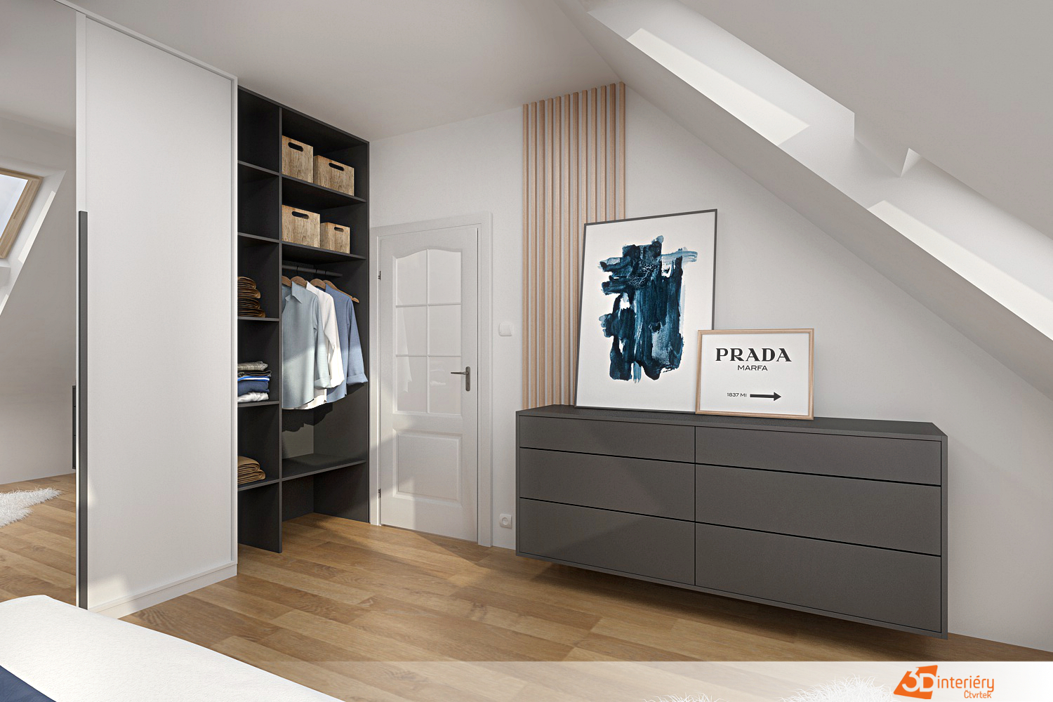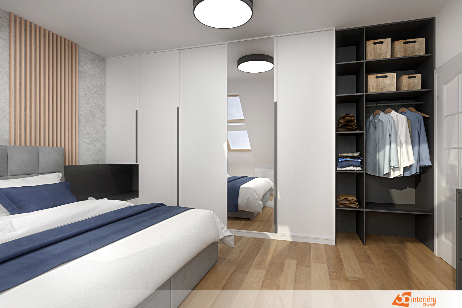 Ložnice nepůsobí přeplněně, každé místo plní jasný účel. Osvětlení kombinuje stropní lampu s nočními světly, což umožňuje různé světelné nálady. Úložné prostory pod postelí a ve vestavěné skříni udržují pořádek bez narušení estetiky. Celý prostor podporuje nerušený spánek, pomalé ráno i klidný večer.