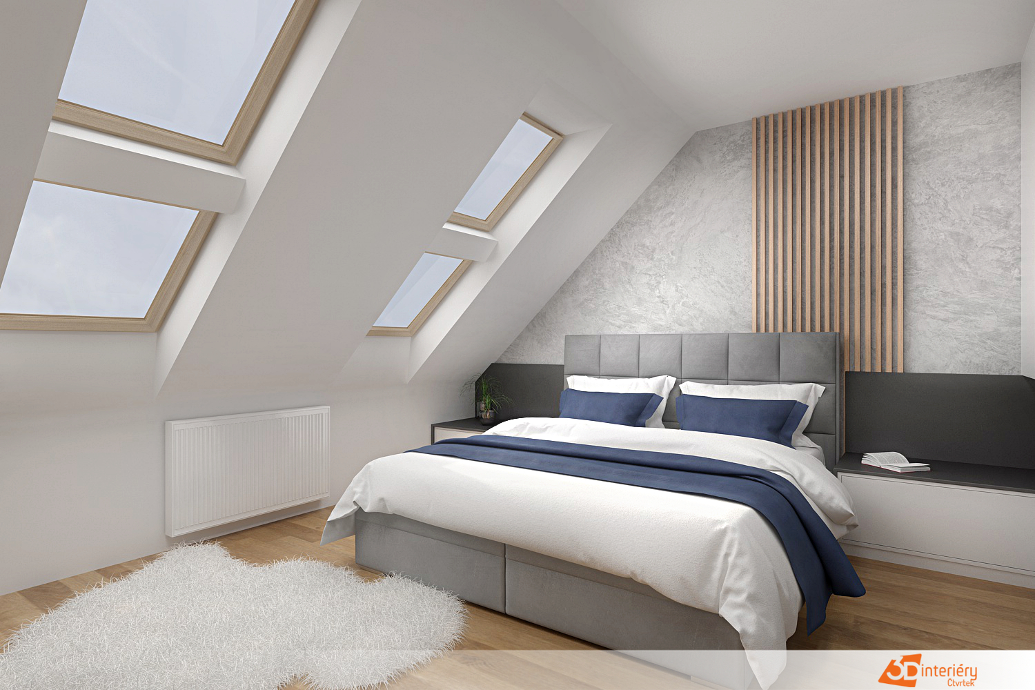 Útulná ložnice se sešikmeným stropem vytváří atmosféru klidu, bezpečí a soukromí. Šikmá část stropu dodává prostoru charakter i osobitost, zatímco tlumené barvy na stěnách podporují odpočinek. Postel s vysokým čelem stojí pod nižší částí stropu, kde vzniká chráněné místo pro spánek i relaxaci. Nad lůžkem visí světelný řetěz, který večer navozuje jemnou náladu.