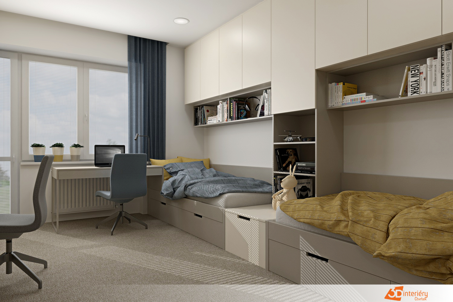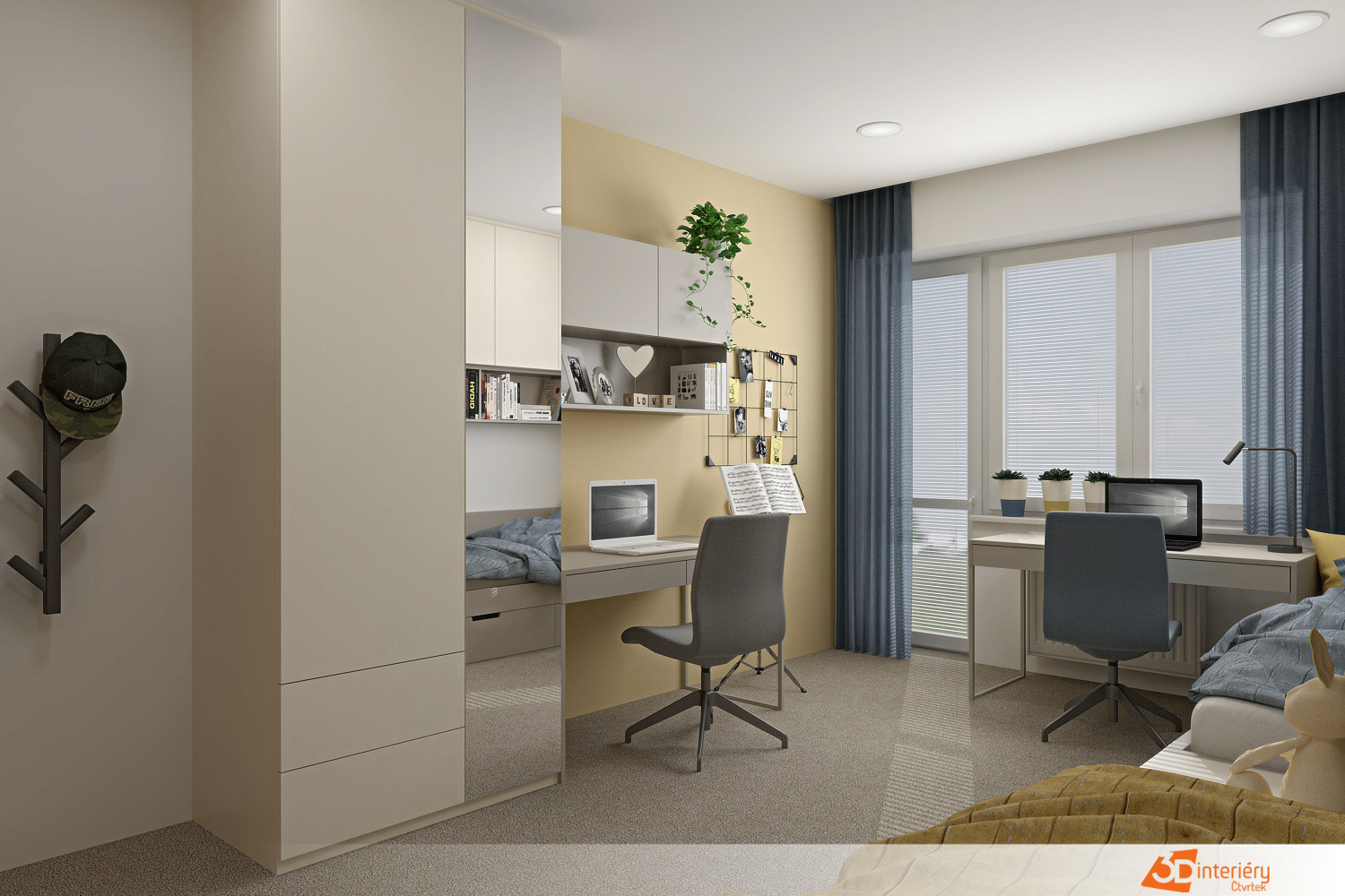 Postel stojí u okna a poskytuje výhled na koruny stromů nebo městské střechy. Měkké přikrývky, praktické úložné boxy a pohodlné polštáře vytvářejí ideální zázemí pro večerní relax. Psací stůl z masivu nabízí dostatek místa na učení i kreativní práci. Kvalitní židle drží záda ve správné poloze i během dlouhých hodin čtení.