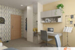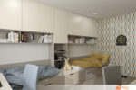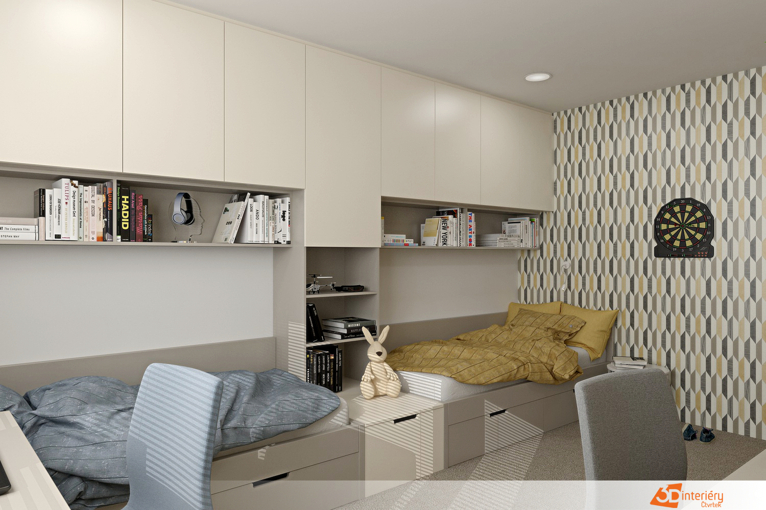 Útulný pokoj pro studenty vznikl s jasným cílem – podpořit soustředění, klid i odpočinek. Každý detail propojuje funkčnost s estetikou. Na první pohled zaujme moderní tapeta, která pokrývá jednu ze stěn. Geometrický vzor v tlumených barvách oživuje prostor, aniž by odváděl pozornost.