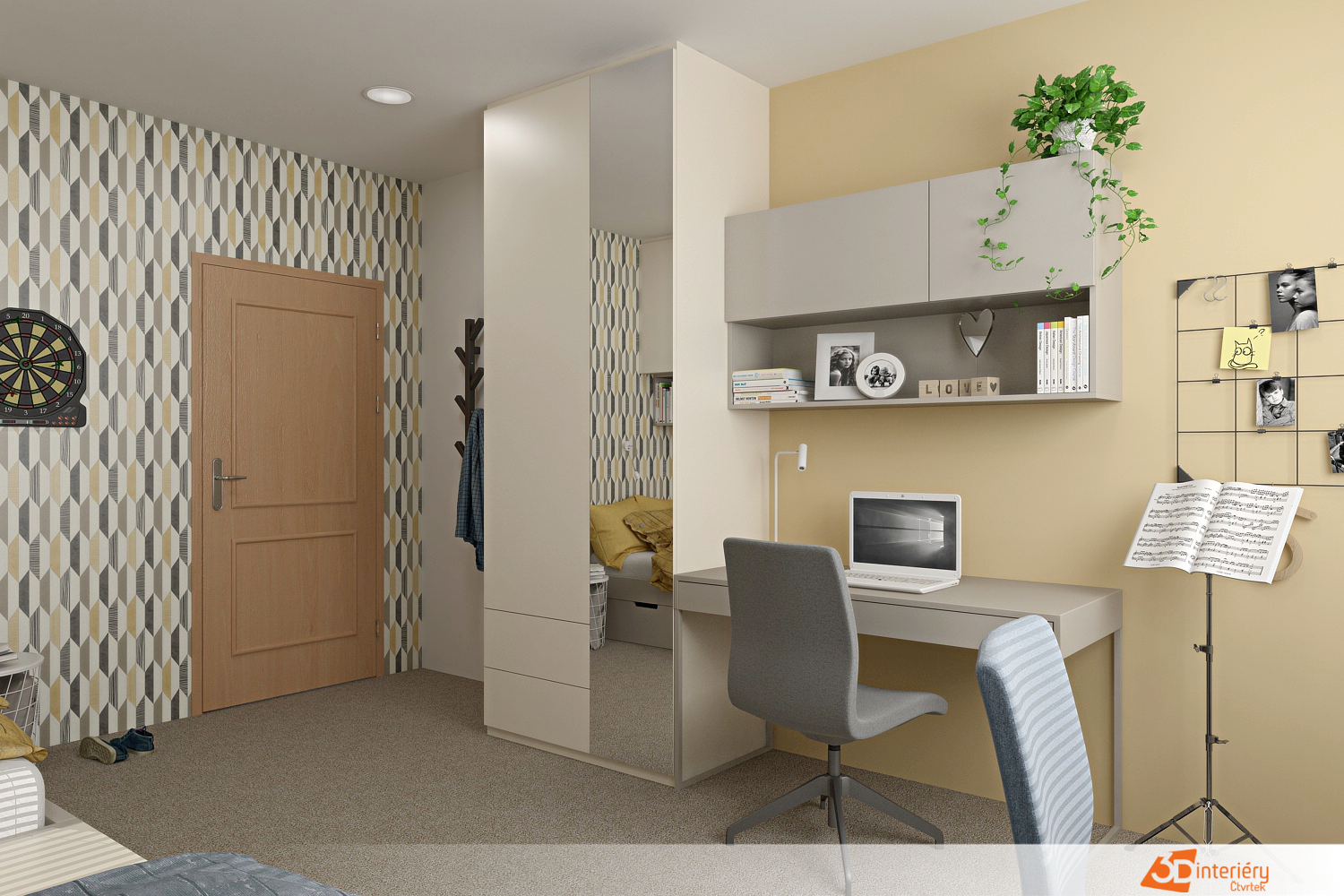 Regály pojmou učebnice, osobní předměty i drobné dekorace. Lampička se stmívatelným světlem umožňuje plynulý přechod od učení k odpočinku. Koberec pod nohama zajišťuje příjemný kontakt se zemí, zatímco tlumené barvy podporují klidné naladění.