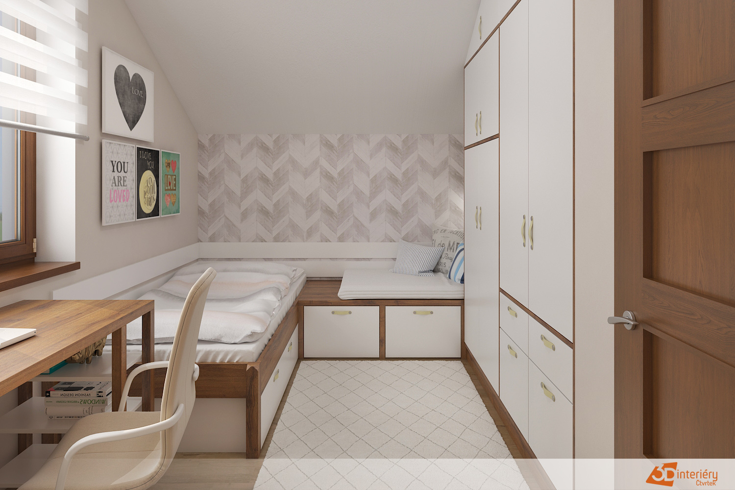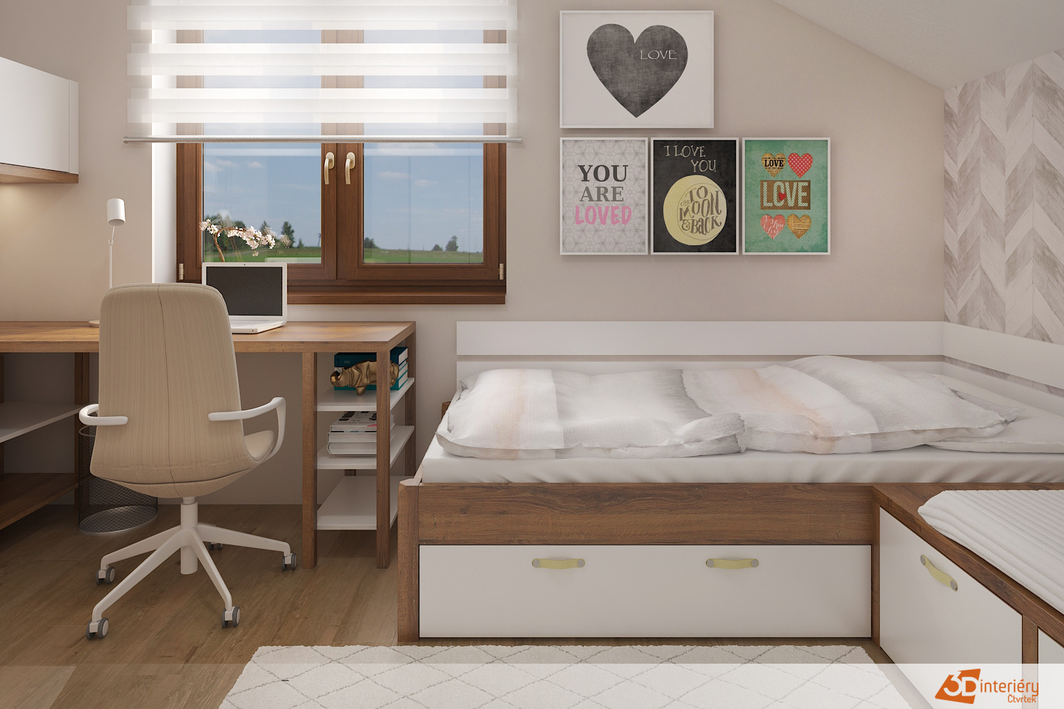 Postel stojí u stěny naproti oknu. Je široká, pohodlná a zve k odpočinku i lenošení během volných chvil. Měkké polštáře a teplá deka dotvářejí celkový dojem bezpečí a pohody. Vedle postele se nachází psací stůl, který tvoří praktický pracovní kout