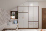 Útulný pokoj vítá teplou atmosférou a promyšleným uspořádáním. Velká bílá skříň upoutá pozornost hned při vstupu. Její hnědé dřevěné orámování zvýrazňuje čisté linie a dodává celému prostoru přirozený kontrast. Skříň nabízí dost místa na oblečení, doplňky i sezónní věci, takže pokoj zůstává přehledný a vzdušný.