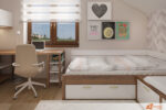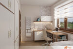 Stůl poskytuje dostatek prostoru na knížky, poznámky i počítač. Blízkost postele umožňuje hladký přechod mezi soustředěním a odpočinkem. Na stole stojí lampička s teplým světlem, která večer vytváří klidné prostředí pro čtení nebo psaní.