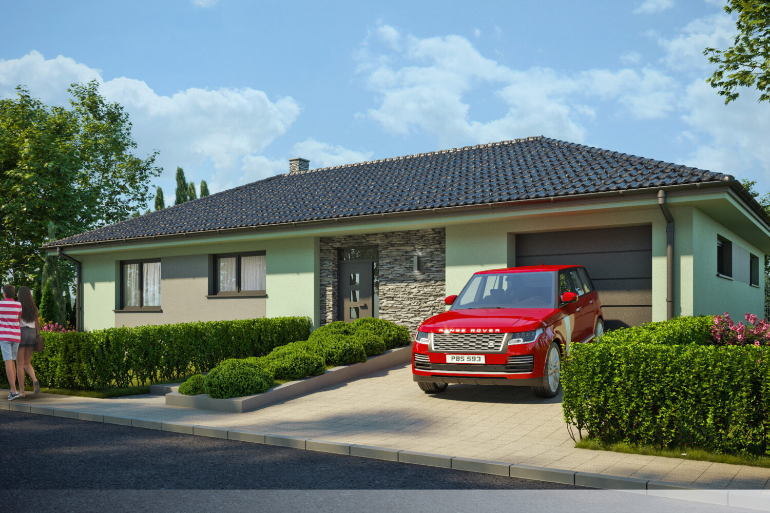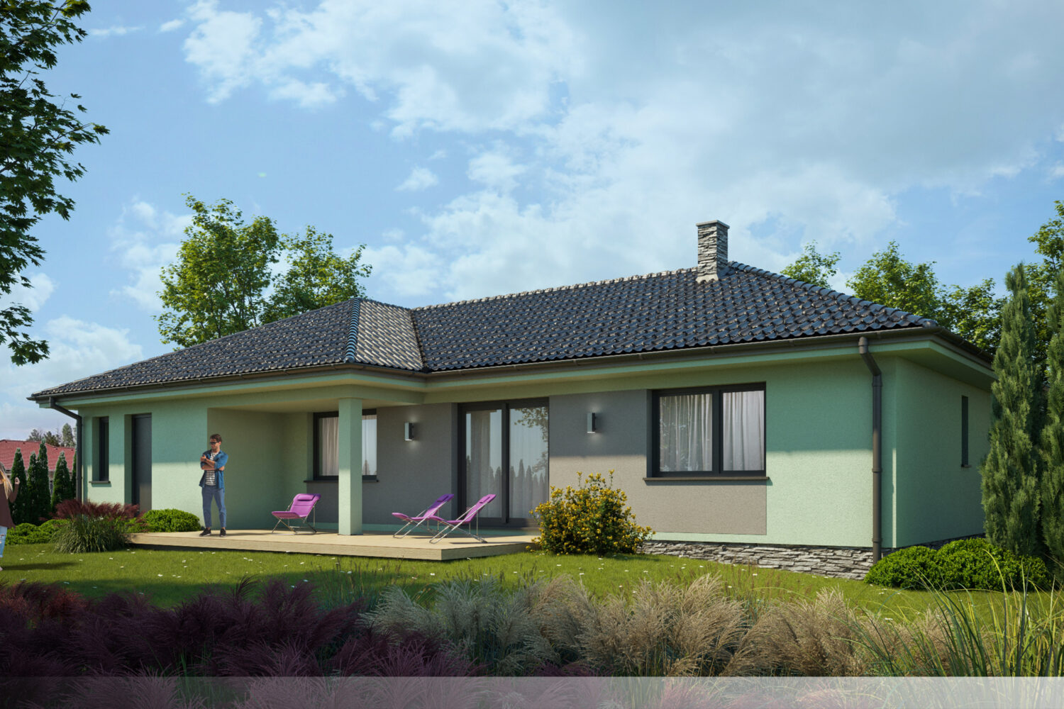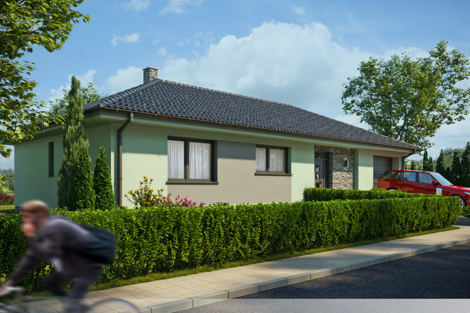 Spojení mátově zelené fasády s tmavě šedým kamenem vytváří harmonický, avšak dynamický vzhled. Přírodní tóny barev působí vyváženě, zatímco kontrastní materiály dodávají stavbě charakter a výraznost. Tento design podtrhuje moderní a současný styl domu, který se nebojí kombinovat barvy a struktury pro zajímavý vizuální efekt.